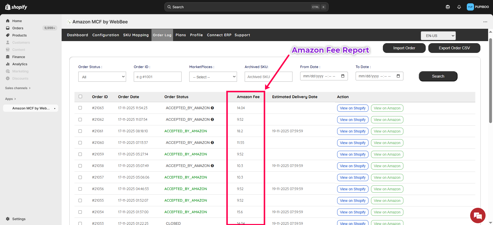 Once this setting is enabled, all your Amazon charges on each order will appear on the Order Log page.