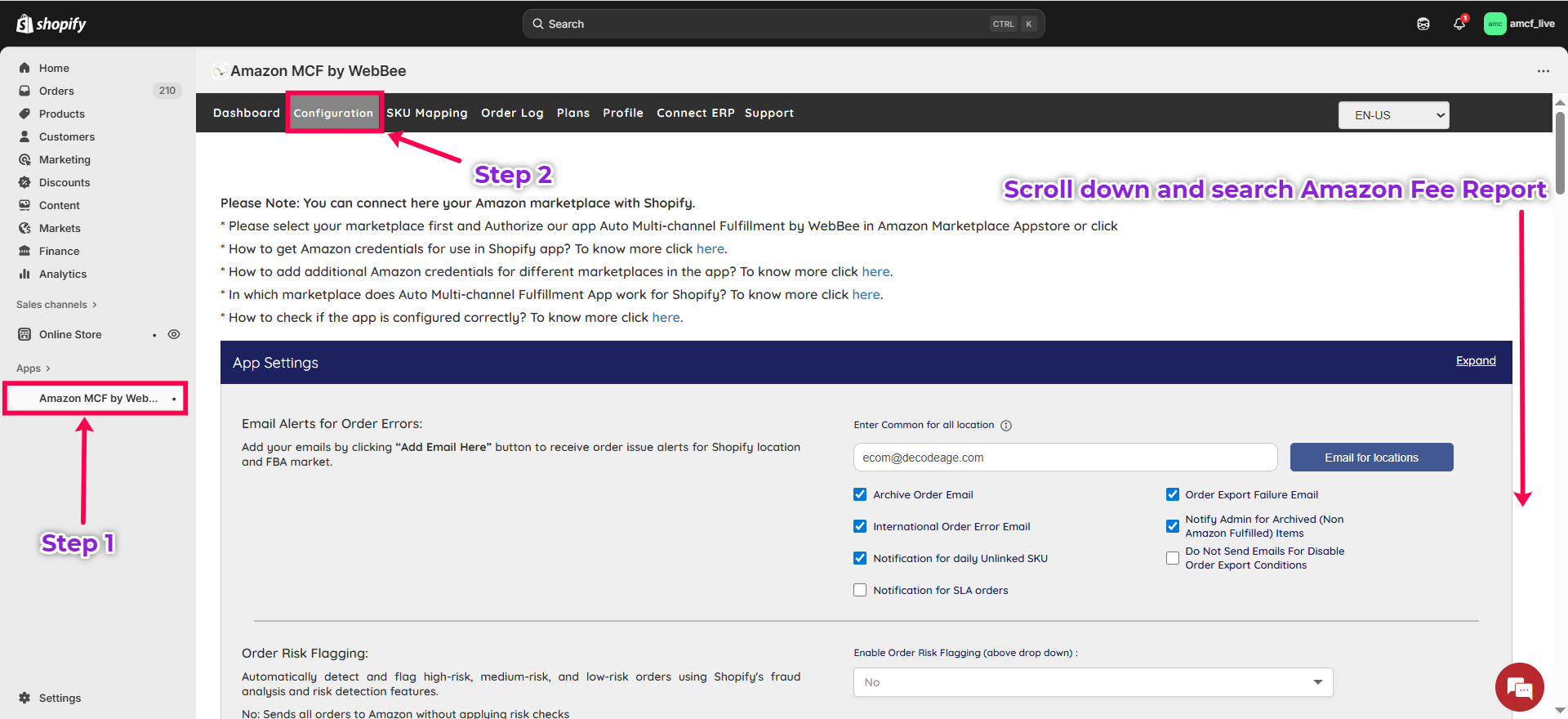 Open the Amazon MCF by Webbee in your Shopify store, then click on the configuration page and search for "App Settings".