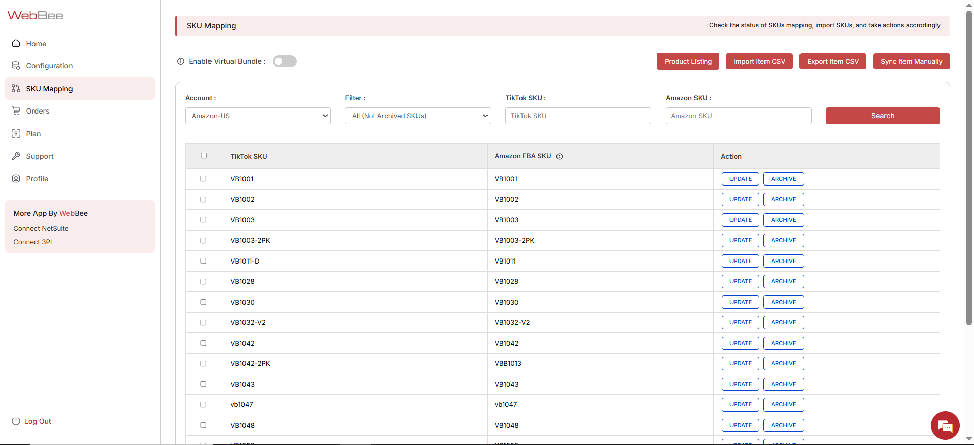 By default, our app will automatically map SKUs between your TikTok store and Amazon FBA if they are the same. If the Amazon SKUs are different, the field will be left empty. After clicking the Update button, you will need to manually map them.
