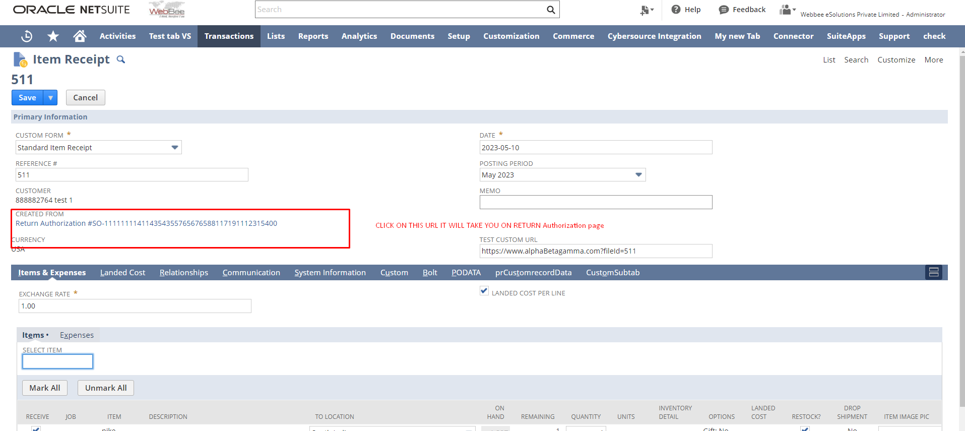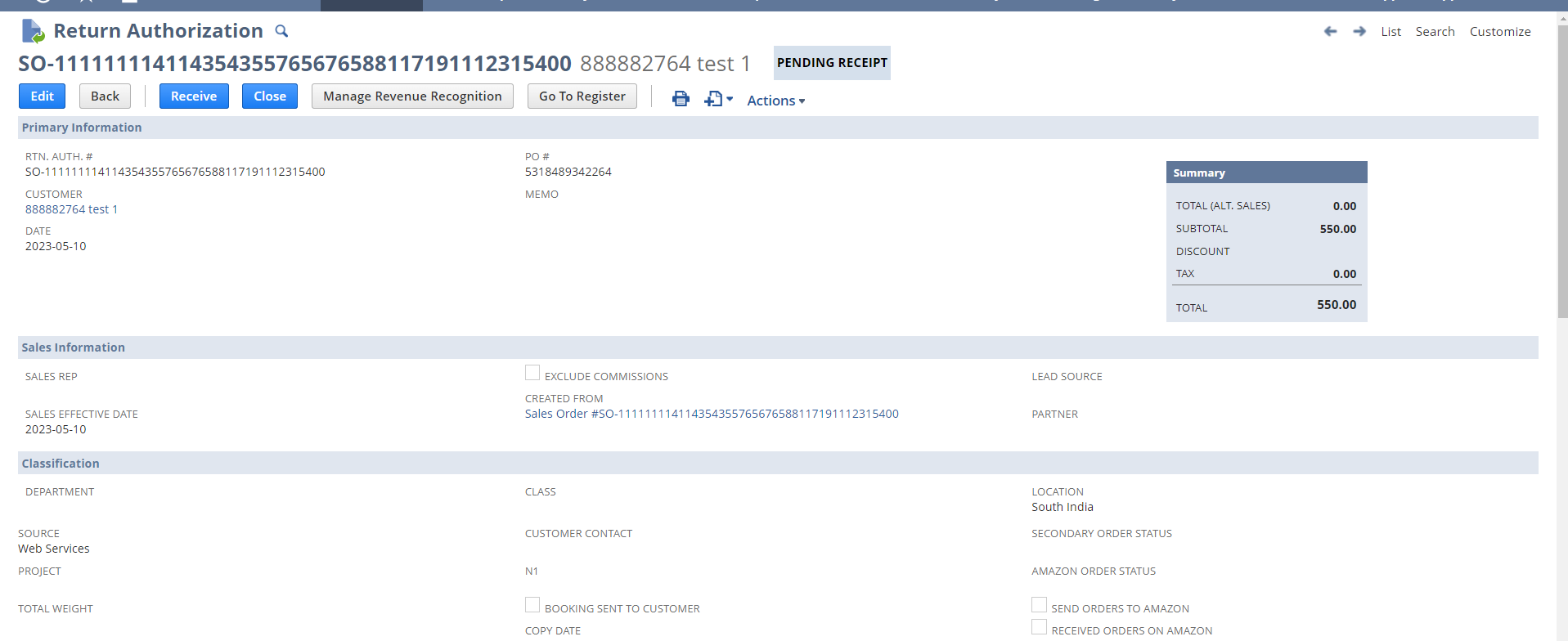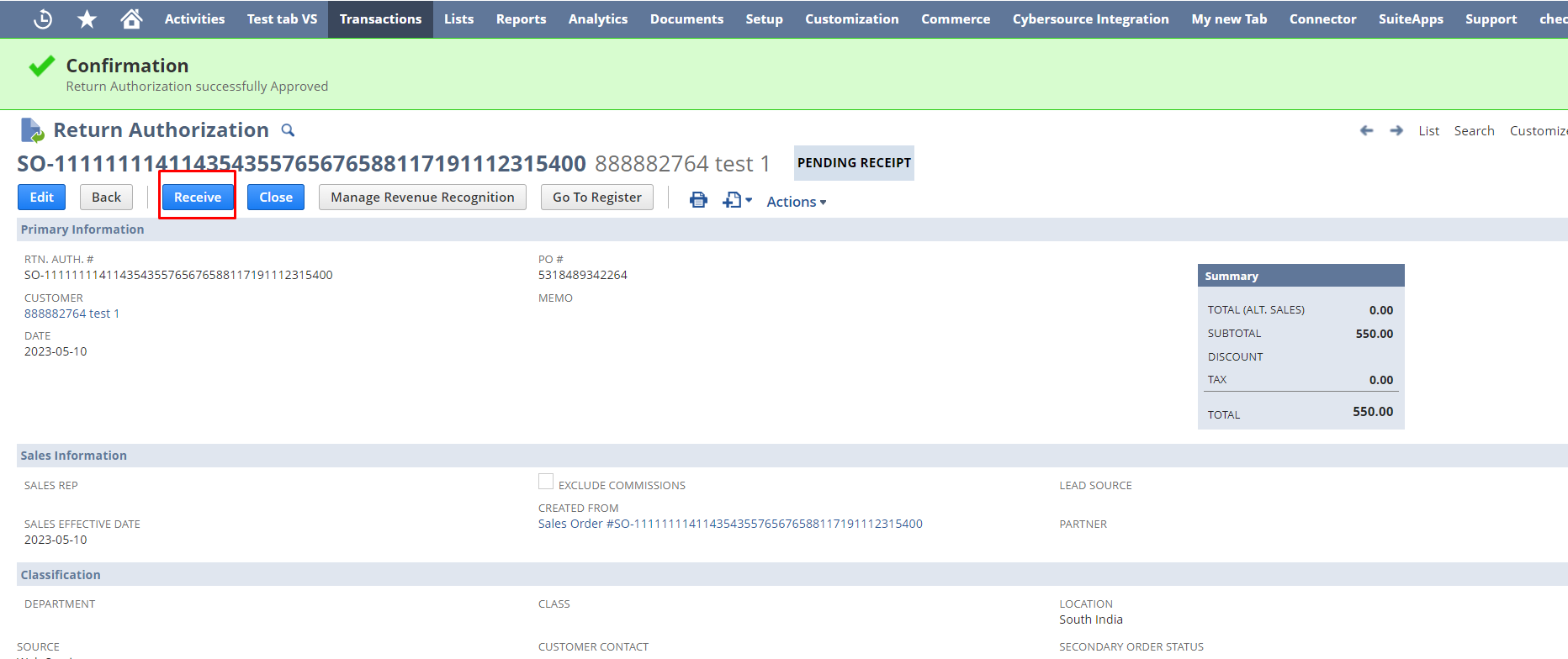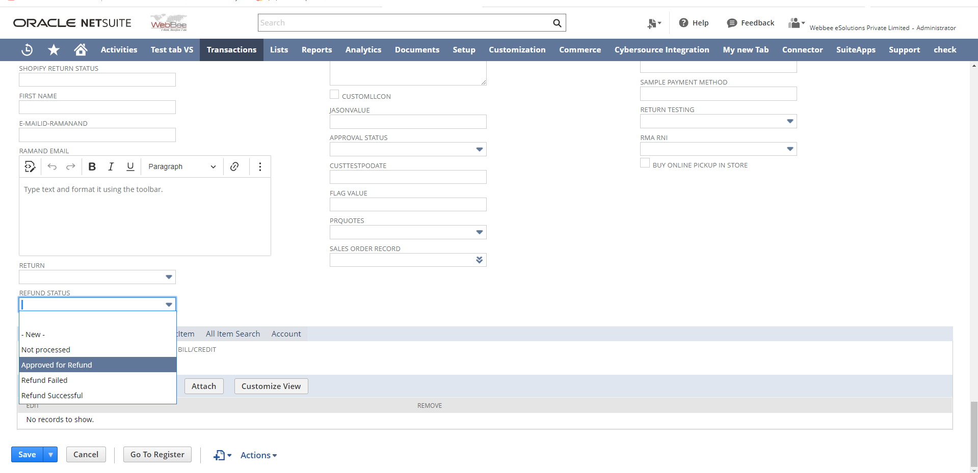 The below screenshot shows how the Refund Authorization is created in NetSuite