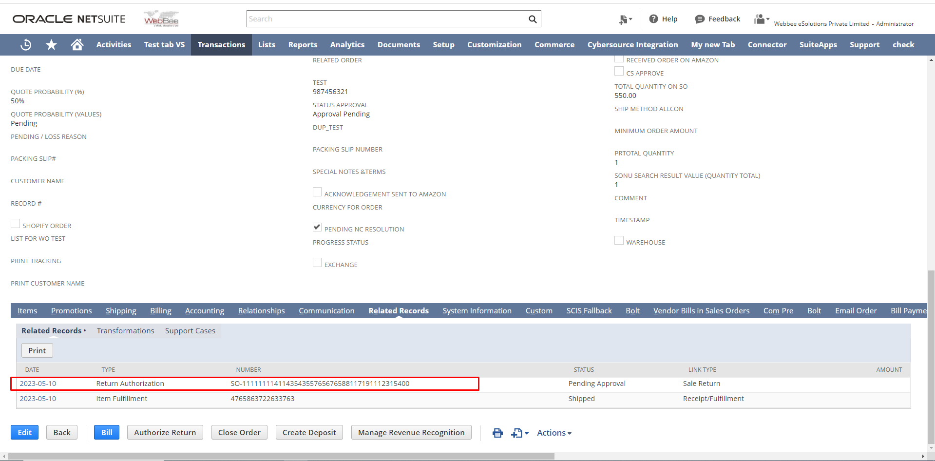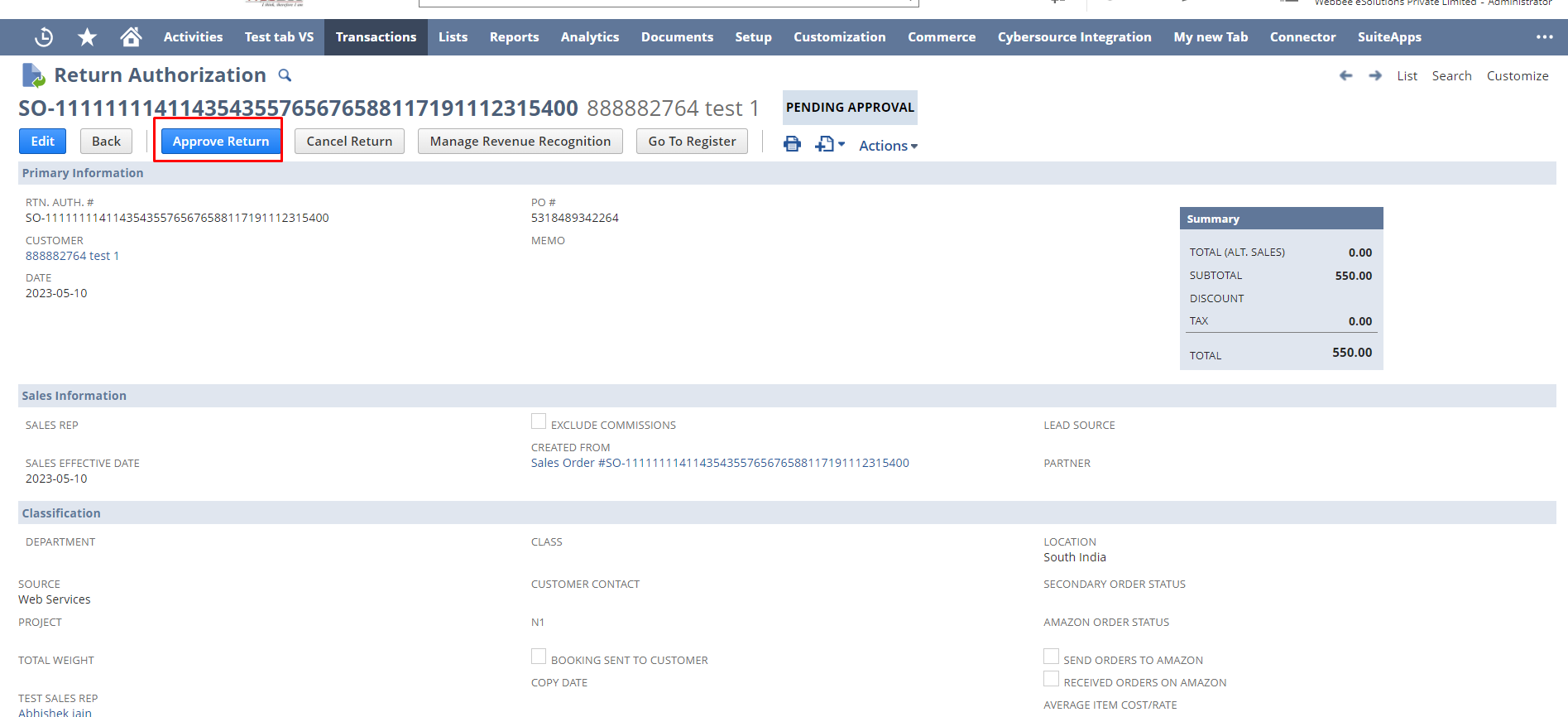 Now , after this click on the Approve Return button to initiate the refunds in NetSuite.