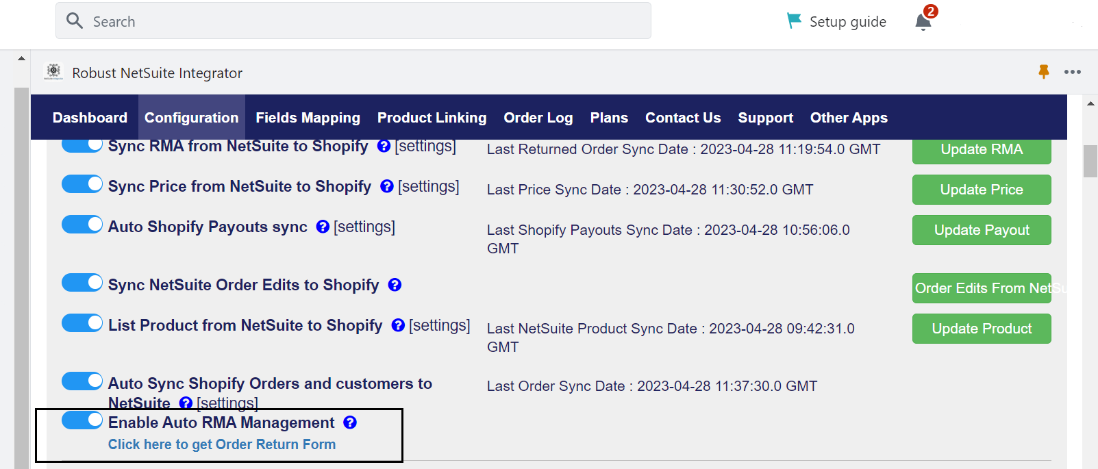 Log in to your Shopify store and open our Robust NetSuite Integrator app from the Apps section, further click to the Configuration Page > App Settings > Enable toggle for Enable Auto RMA Management a, further hit the Save button. Below is a screenshot to help you understand this visually.