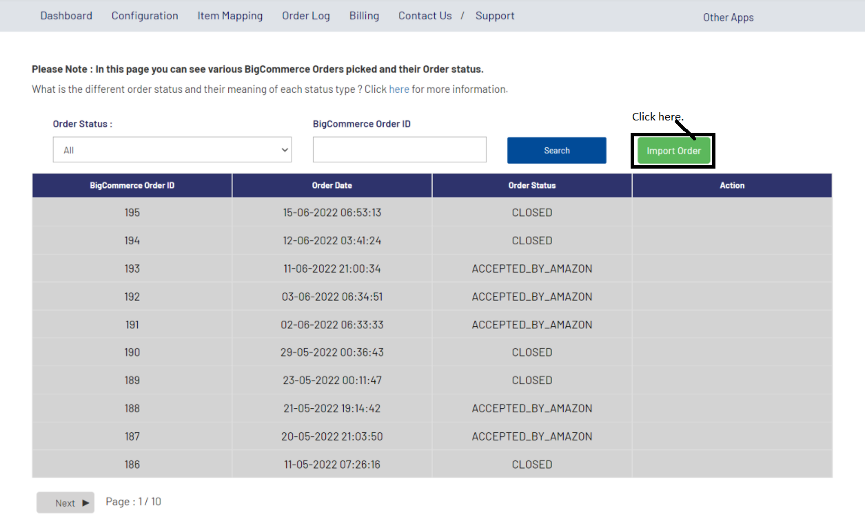 Our order log page contains: One drop-down menu: Order Status. One search field: BigCommerce Order ID. One button: Import Order button. Order Status: From, here you can filter the orders that are either: Pending, Accepted By Amazon, Rejected By ...