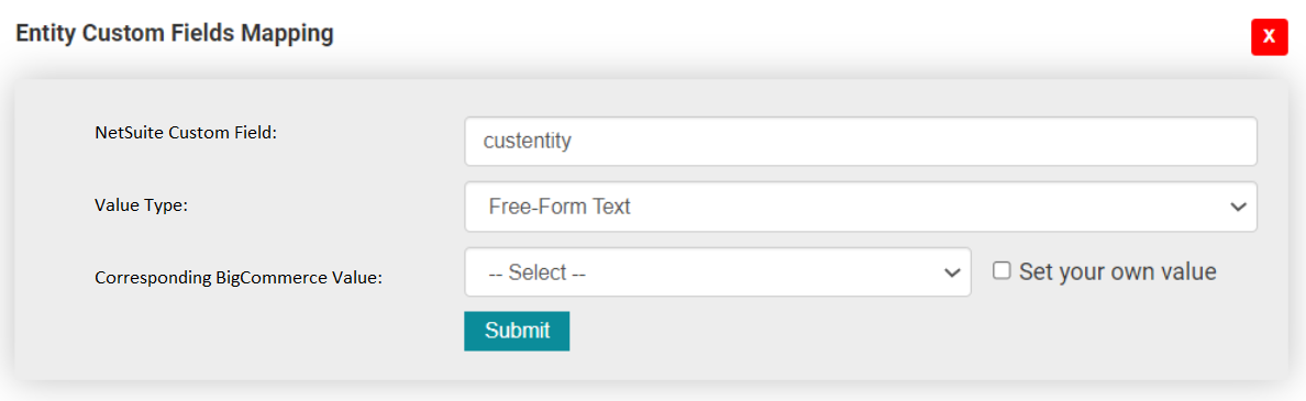 The BigCommerce NetSuite Integrator supports NetSuite's three types of fields i.e. Free-form text, List / Record, and Checkbox. Note: To check a NetSuite checkbox i.e. (custom entity field), once a transaction syncs to NetSuite from your BigCommerce store, just enter the internal ID of a NetSuite custom field in the "NetSuite Custom Field", check the "Set your own value checkbox", and click on the Submit button.