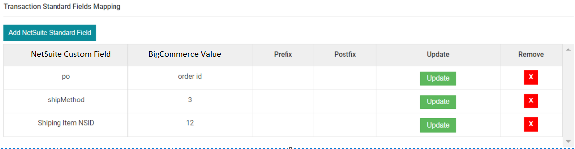 - If you are interested in syncing dynamic values from your BigCommerce store to your NetSuite account in terms of a standard transaction field, then always map between "NetSuite Standard Field", and "Corresponding BigCommerce Value" fields. Example: BigCommerce order ID to NetSuite's standard PO field.