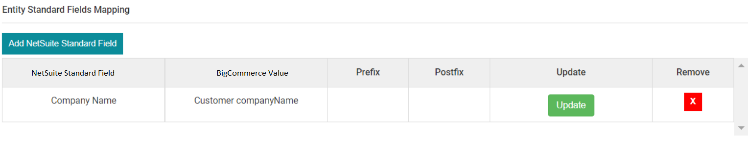 - If you are interested in syncing dynamic values from your BigCommerce store to your NetSuite account in terms of a standard entity field, then always map between "NetSuite Standard Field", and "Corresponding BigCommerce Value" fields. Example: BigCommerce customer name to NetSuite's standard customer name field.