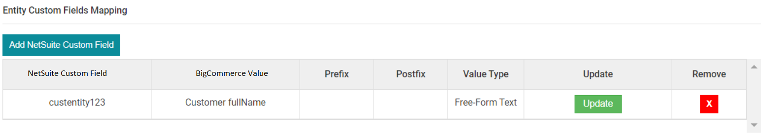 In the above-example, we are syncing the values of this "Customer fullName" BigCommerce customer field to this "custentity123" NetSuite custom entity field.