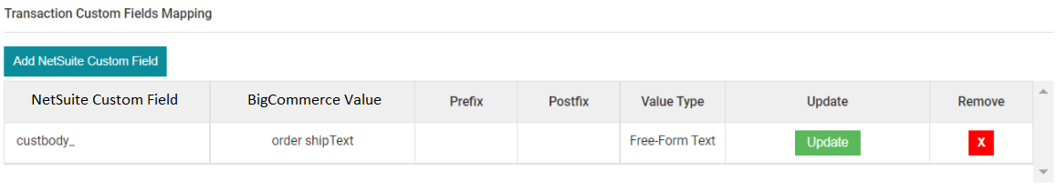 - If you are interested in syncing dynamic values from your BigCommerce store to your NetSuite account in terms of a custom transaction field, then always map between "NetSuite Custom Field", and "Corresponding BigCommerce Value" fields. Example: BigCommerce order ID to NetSuite's custom PO field.
