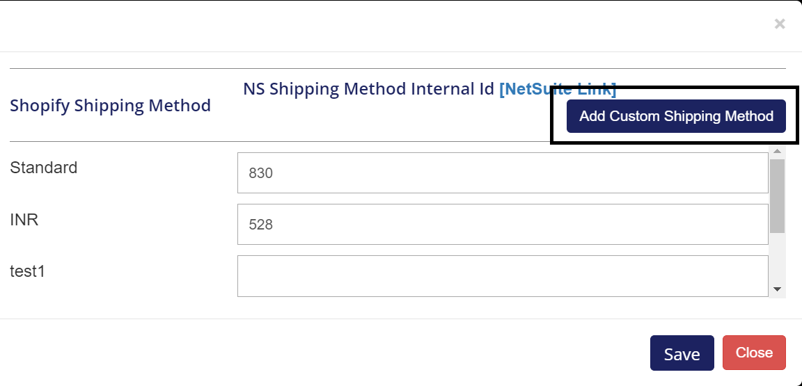 - Click on the Add Custom Shipping Method, and in the first field, enter this order's Shopify shipping method, and in the second field, enter its corresponding NetSuite shipping method internal ID, further hit the Submit button, and Save the changes