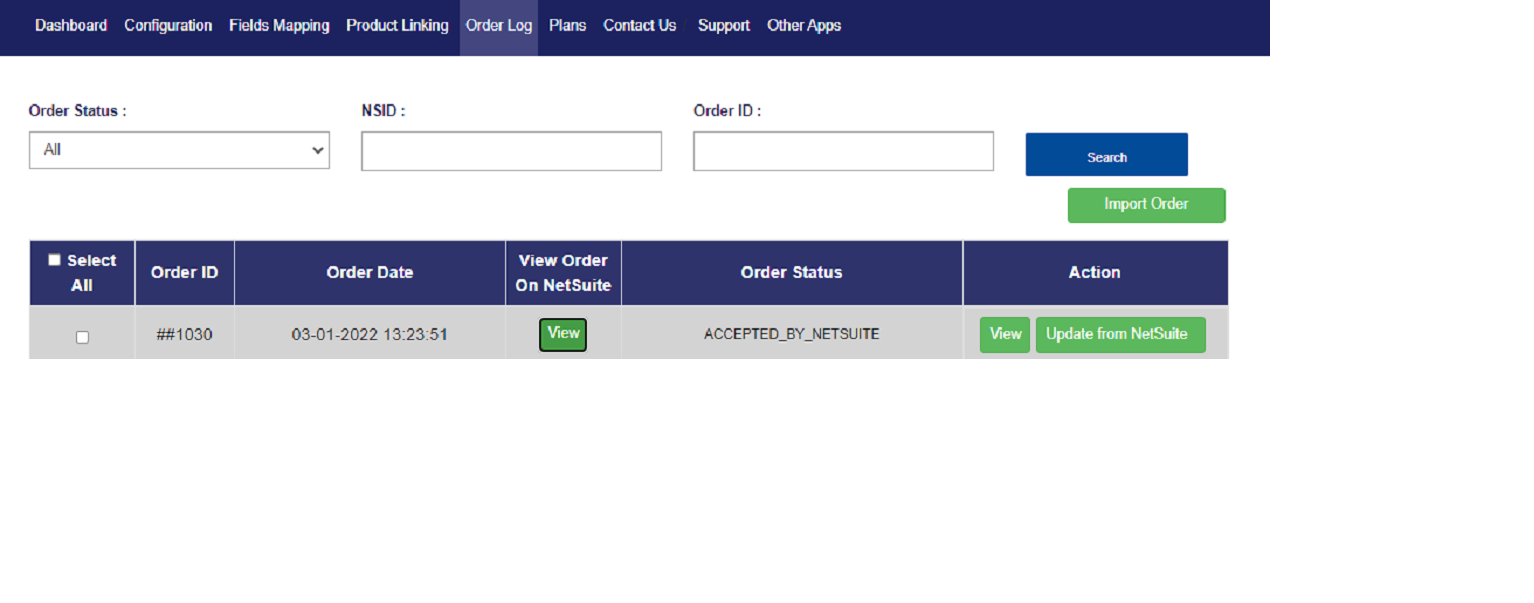 Once the permissions have been re-authorized, head over to the Order Log Page, further click on the View button. This link will take you to the NetSuite order itself. Below is a screenshot to help you understand this visually.
