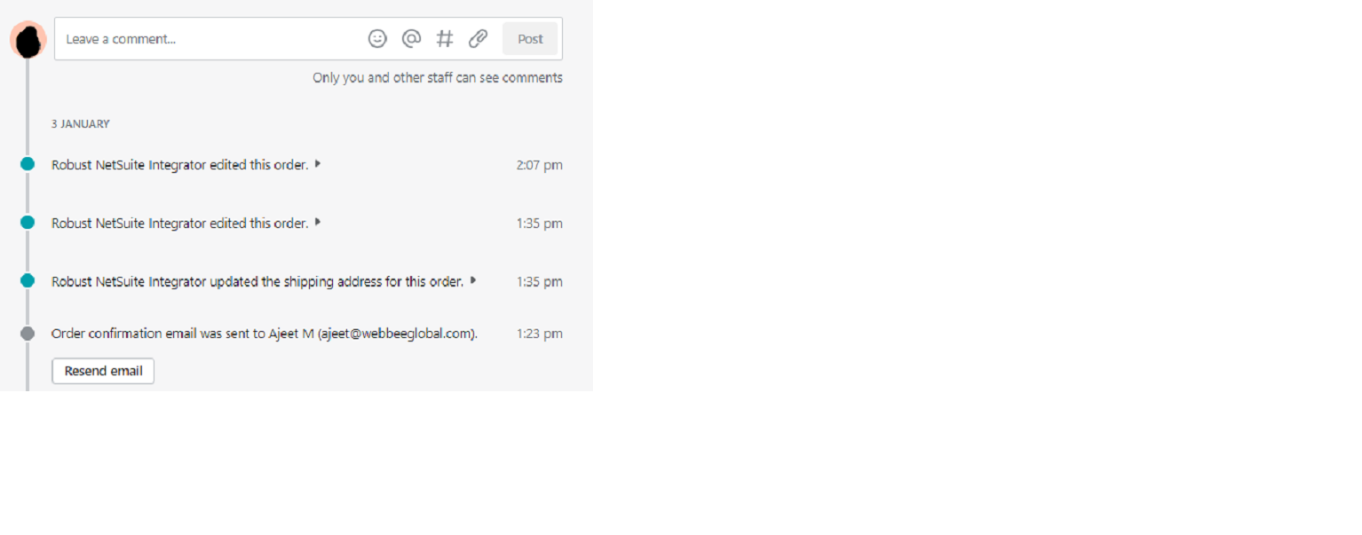 Once an order gets edited inside Shopify, you can always review its timeline to see the changes done by the Robust NetSuite Integrator. Below is a screenshot to help you understand this visually.