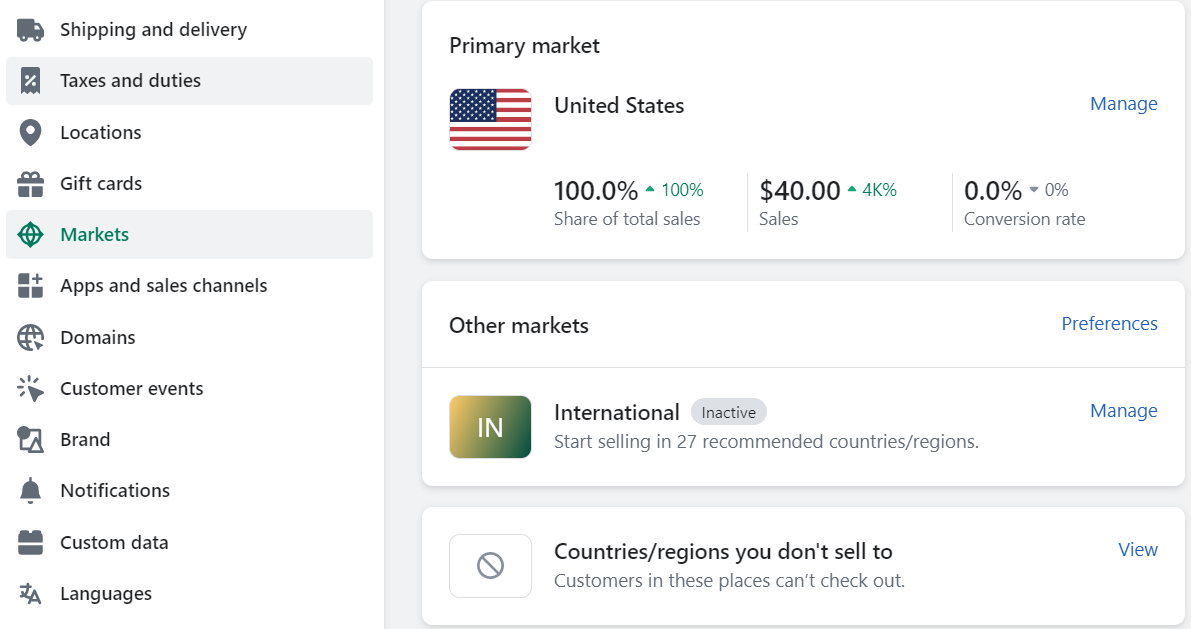 Click Markets: Here you as a merchant can enable the markets required or disable or leave other markets not needed orders from. So the markets which are not added, the customers from these countries would not be able to place orders/ cannot checkout.