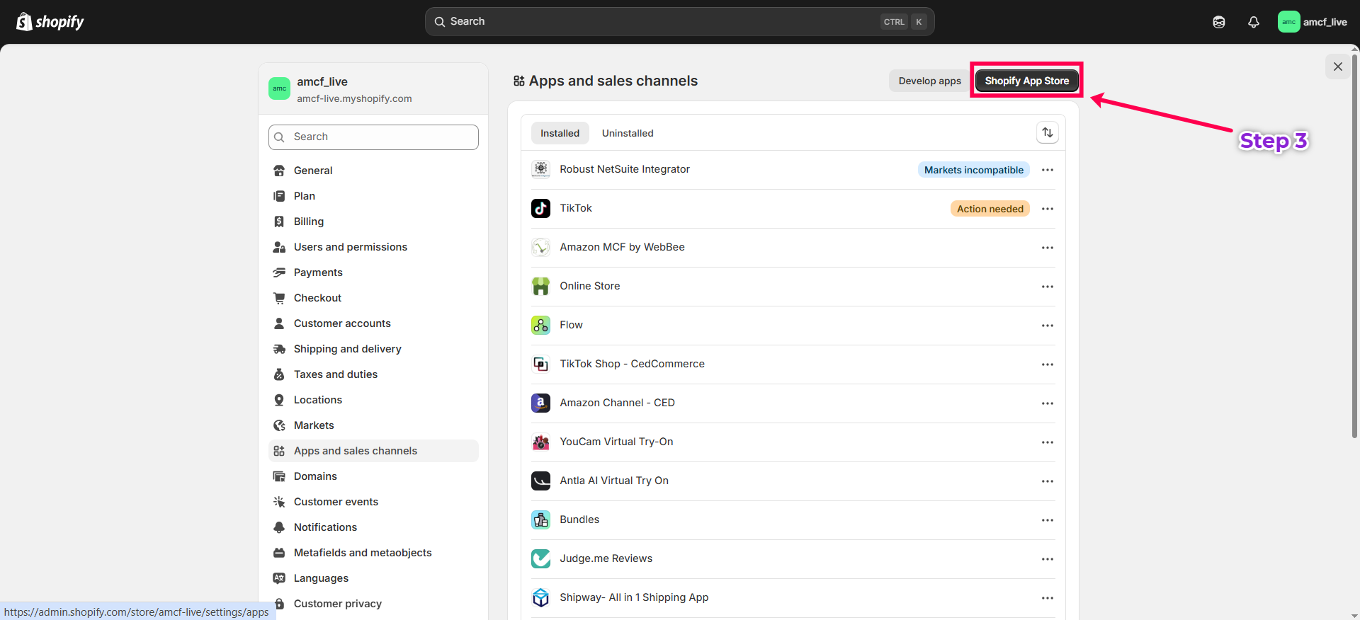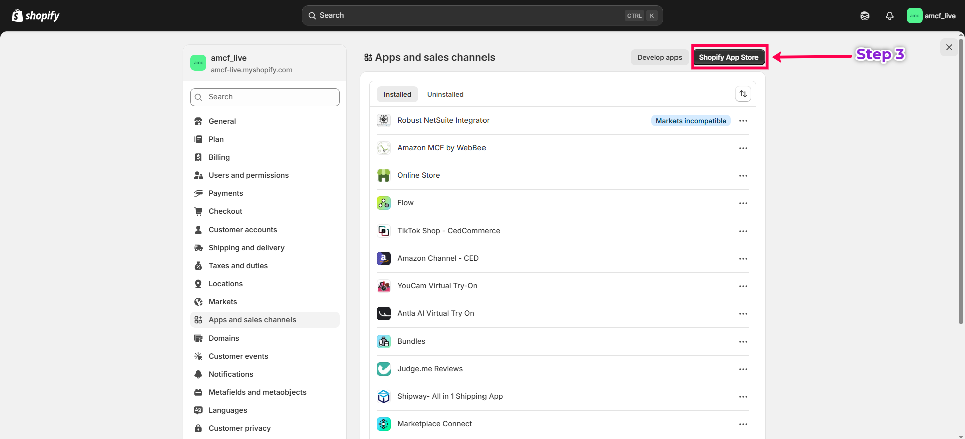 - On the Apps and Sales Channels page, click on the Shopify App Store