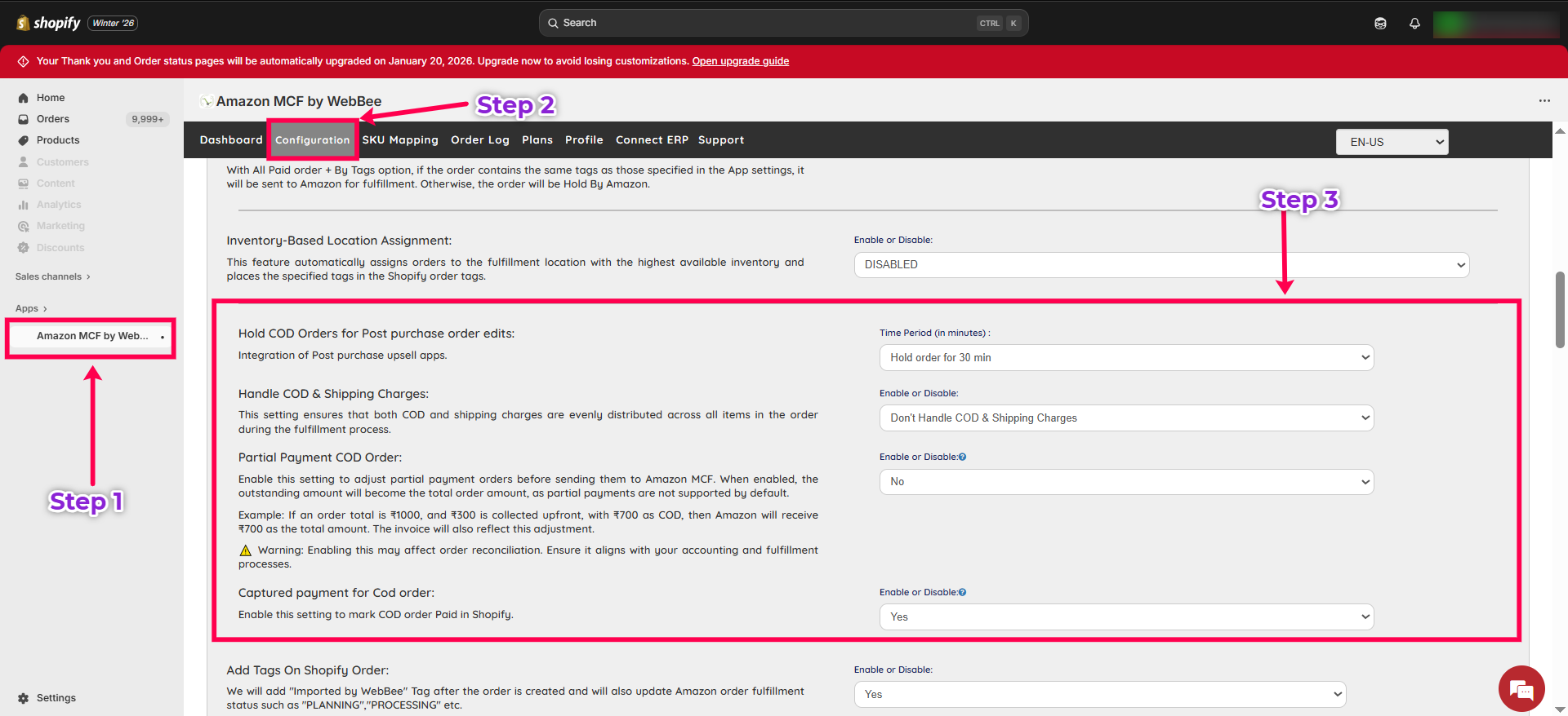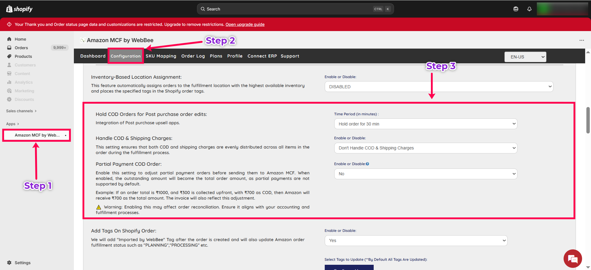 In WebBee AMCF for Shopify, you can manage multiple COD-related functions, including holding COD orders for post-purchase edits, distributing COD and shipping charges, and supporting partial payments on COD orders. Below is a breakdown of how each setting works.