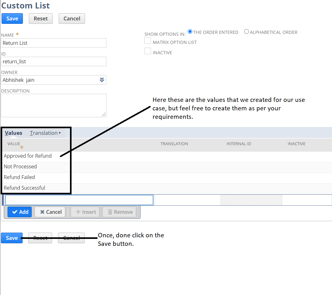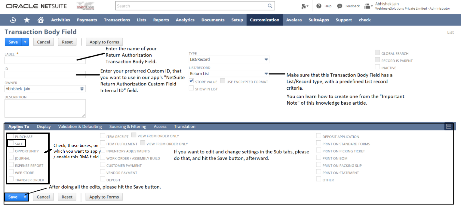Congratulations, now you have successfully created a (List / Record) Type in the return authorization Transaction Body Field itself.