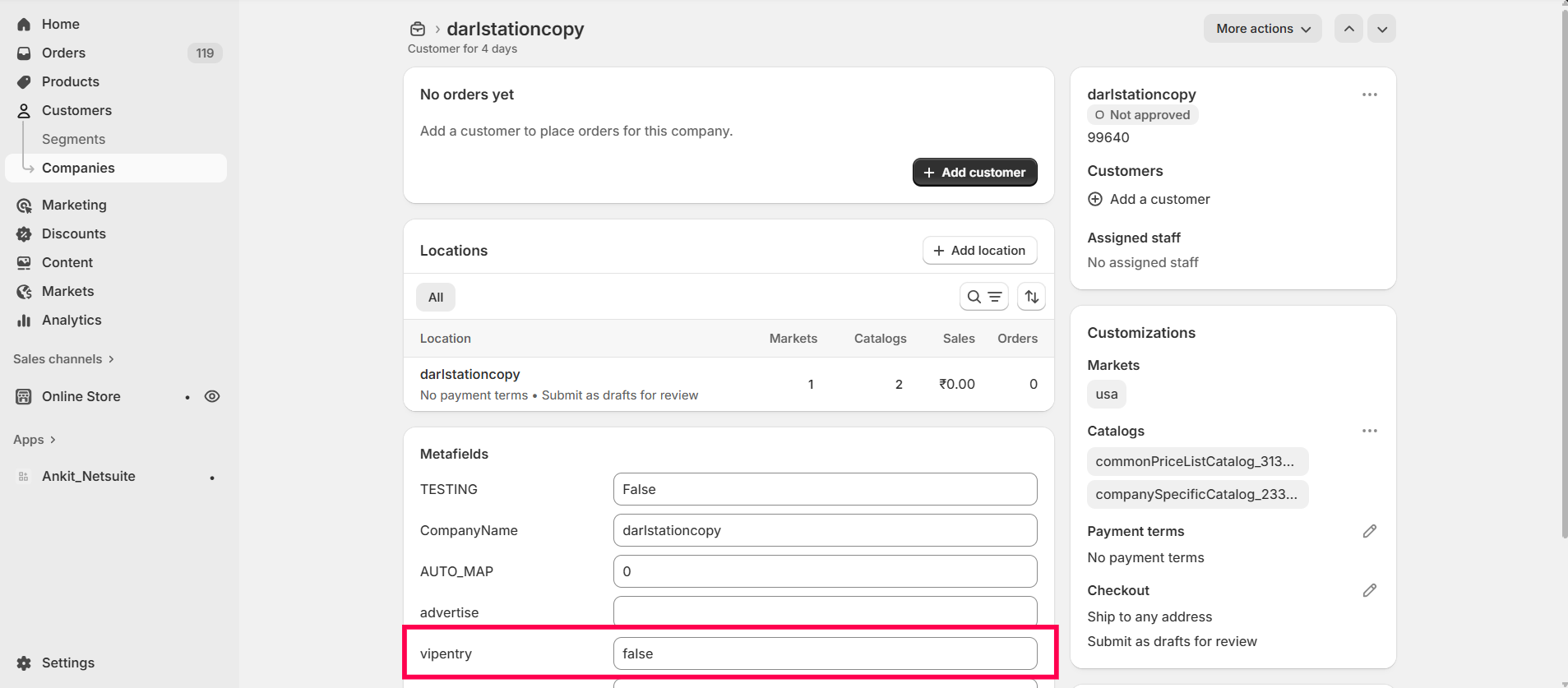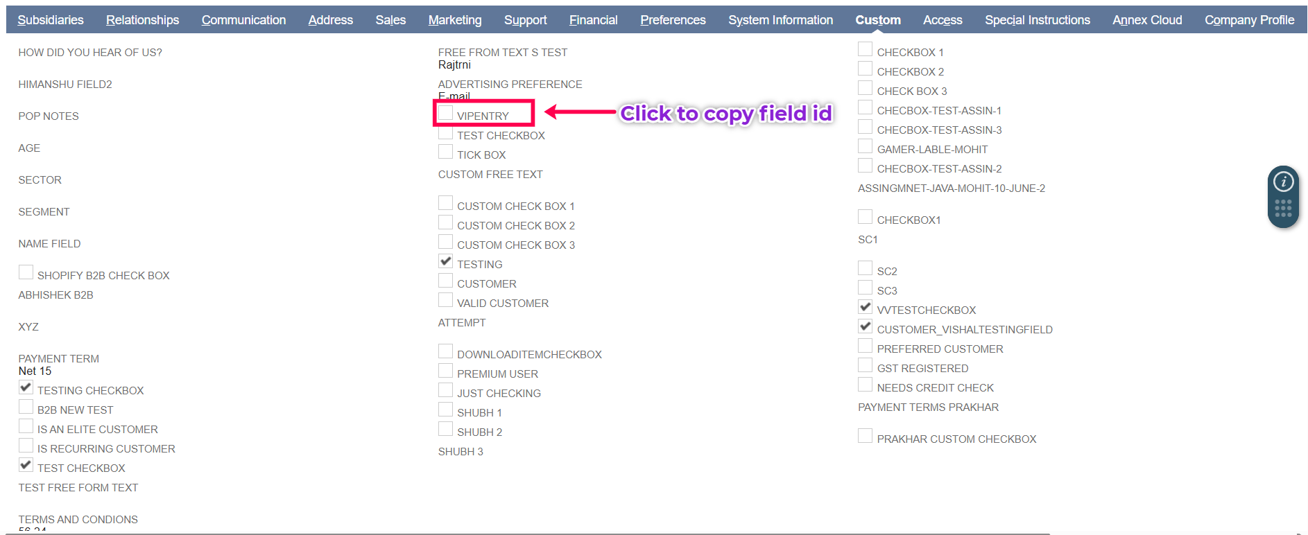 Step 2: Open your NetSuite account and go to the company page. Select the field you want to map to the Shopify metafield; for example, we will map the 'VIPENTRY' NetSuite field to Shopify's VIPENTRY metafield. Click on the field and copy the field ID.
