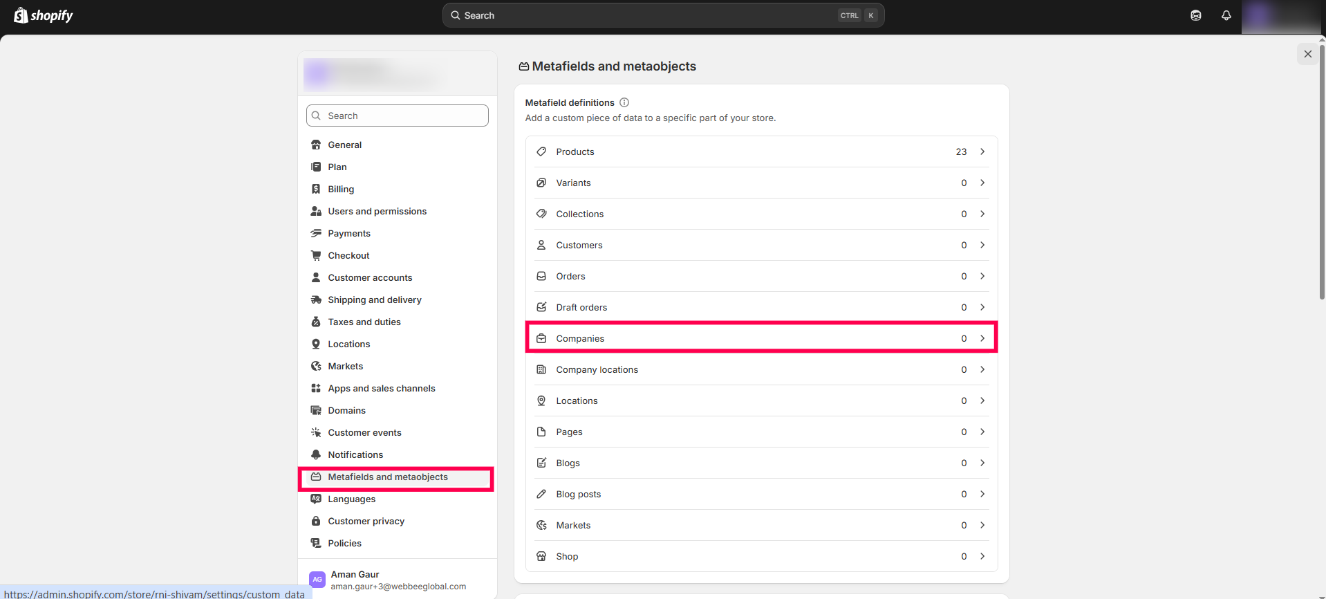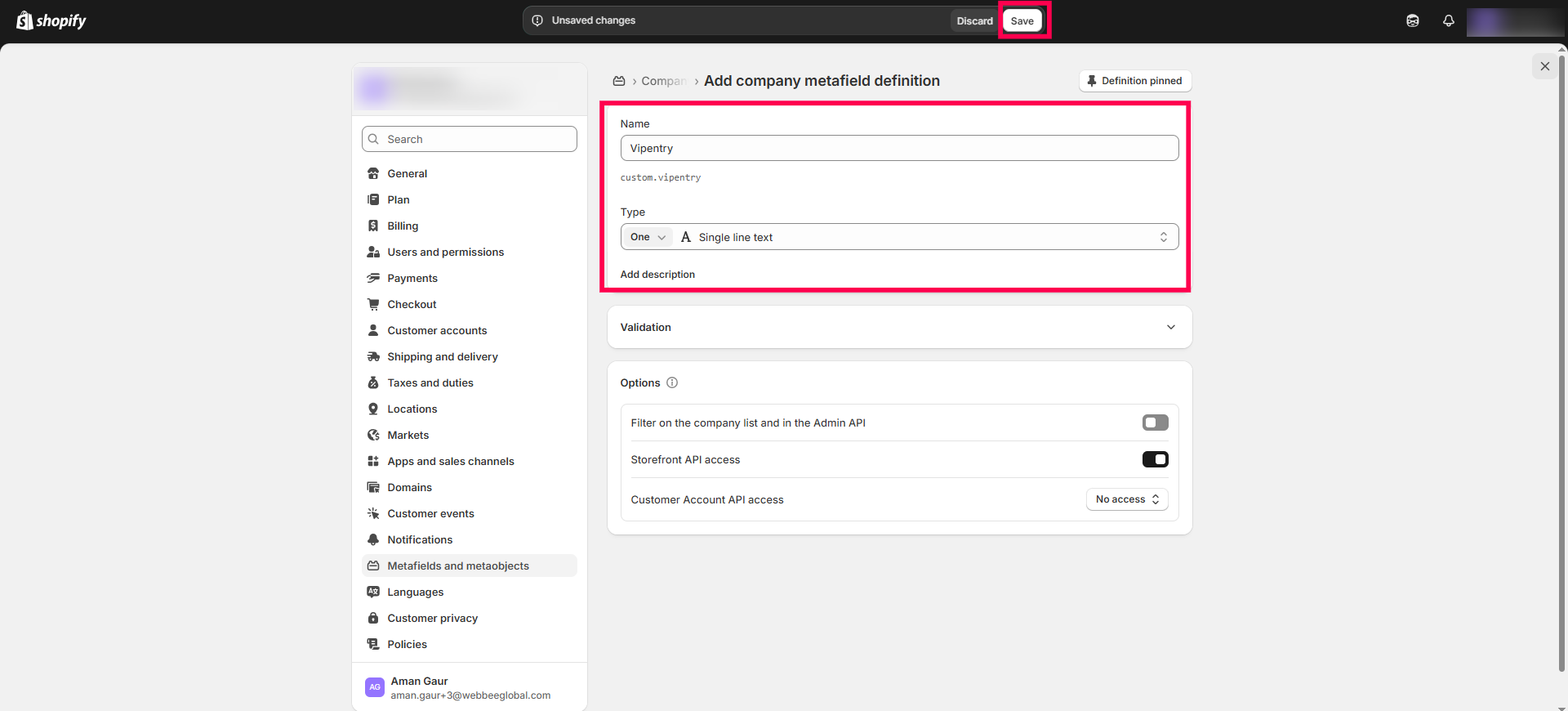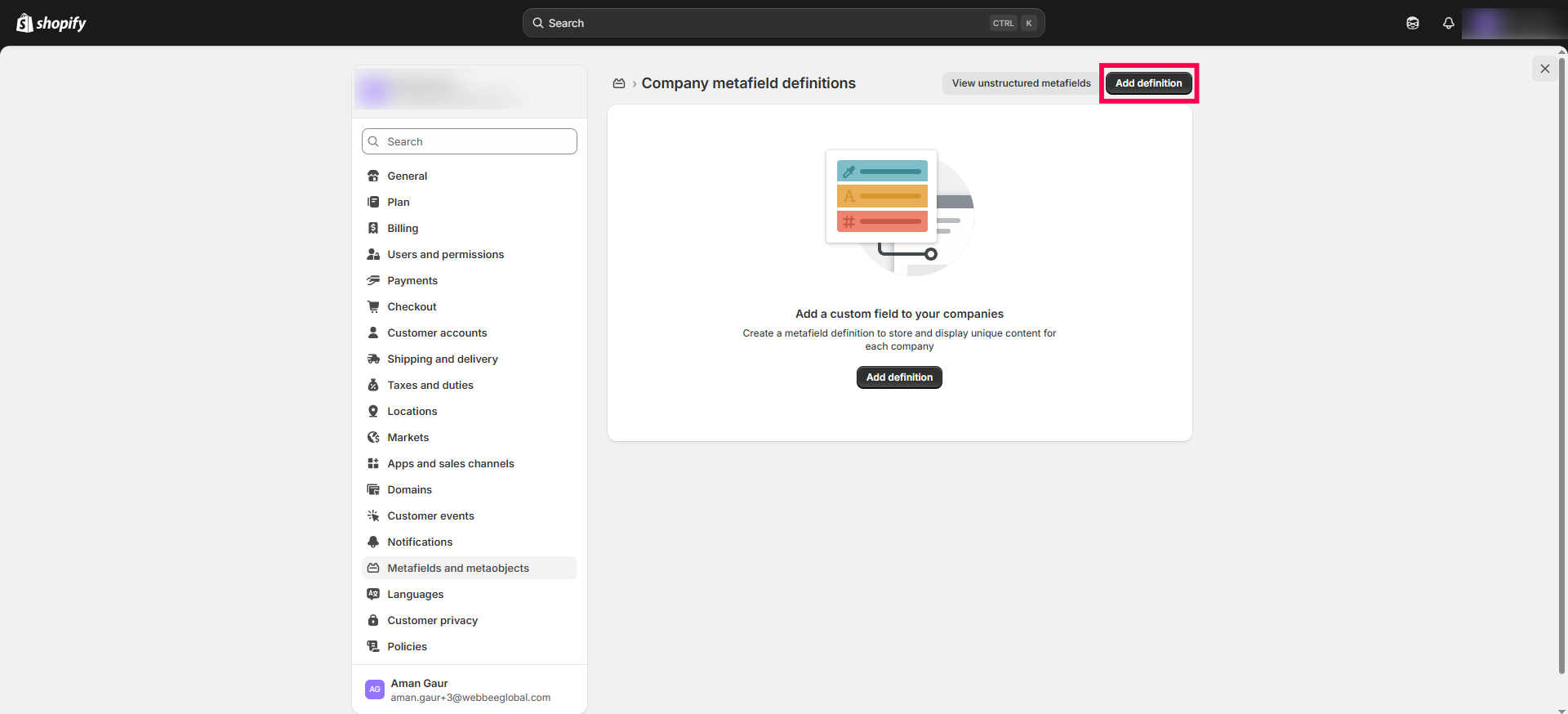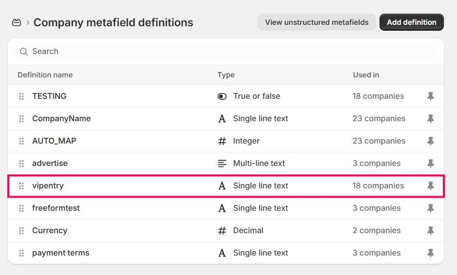 Step 1: Open your Shopify admin account and go to Settings > Metafields and Metaobjects > Companies > Add definitions. Example: Create a Shopify metafield with the name "VIPENTRY".