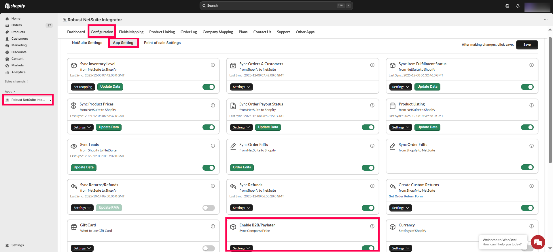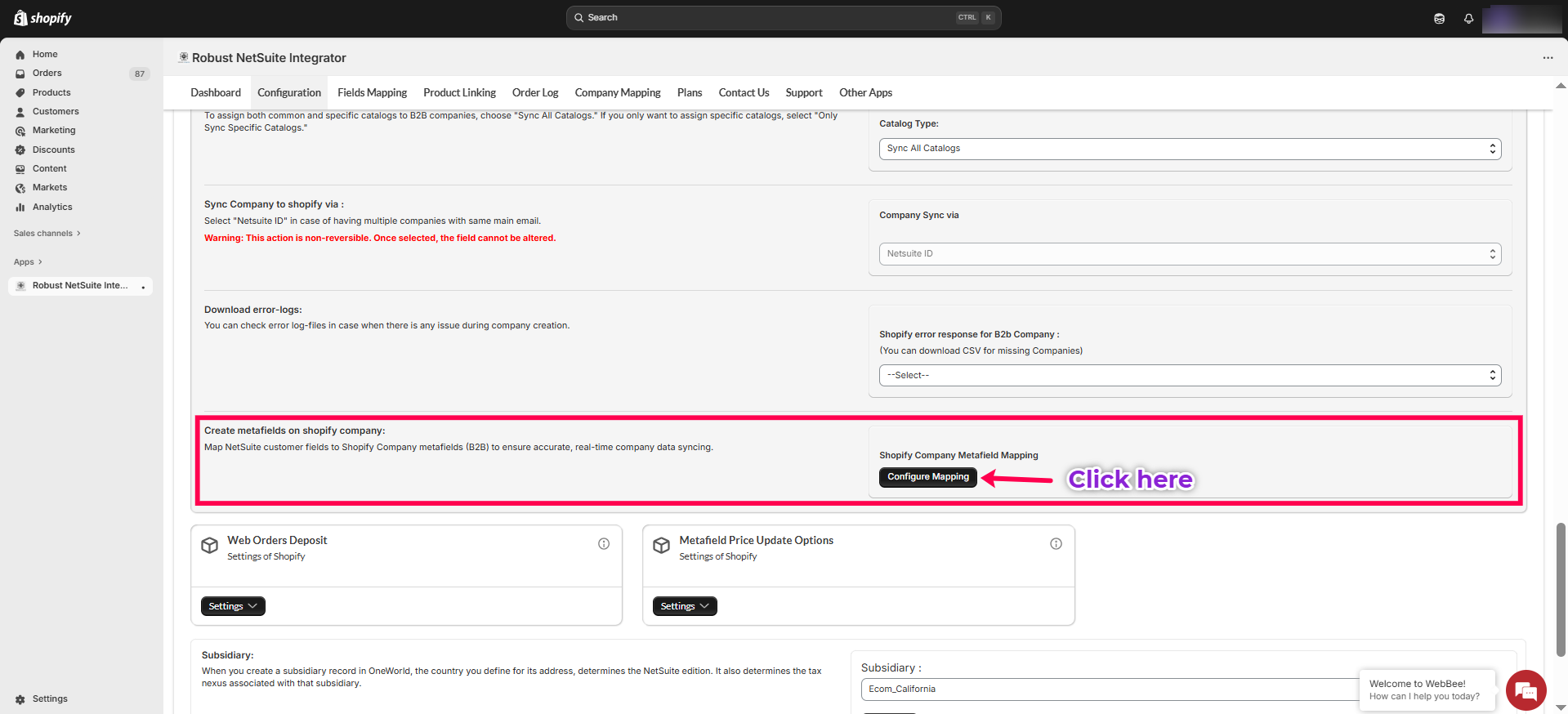 To create, update, or delete metafields on Shopify from NetSuite using WebBee’s Robust NetSuite Integrator B2B features, follow the steps outlined below: