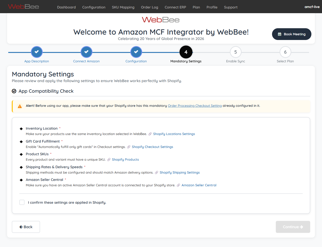 This page displays the mandatory checks needed on both Shopify and our app, ensuring that your order syncs to Amazon MCF and the related actions, i.e., inventory and tracking updates via the Webbee app.
