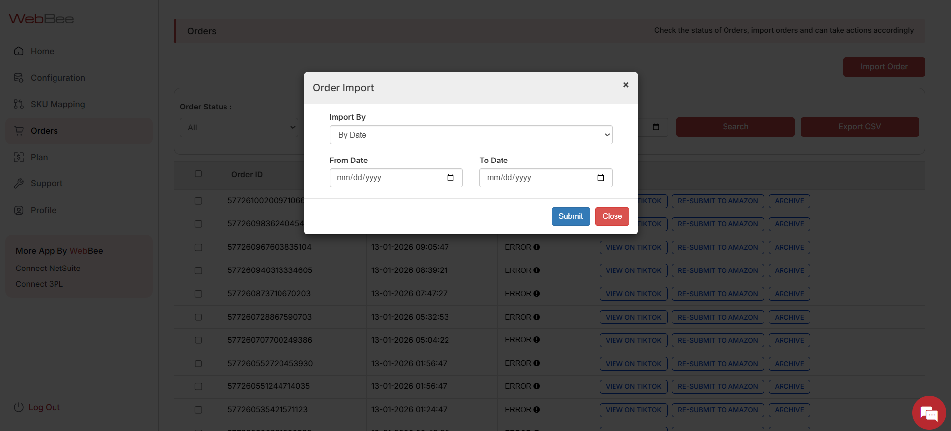 You can import past orders either based on their dates OR order IDs. Once you have chosen your criteria, click on the Submit button. Below is a screenshot just to help you understand this visually.