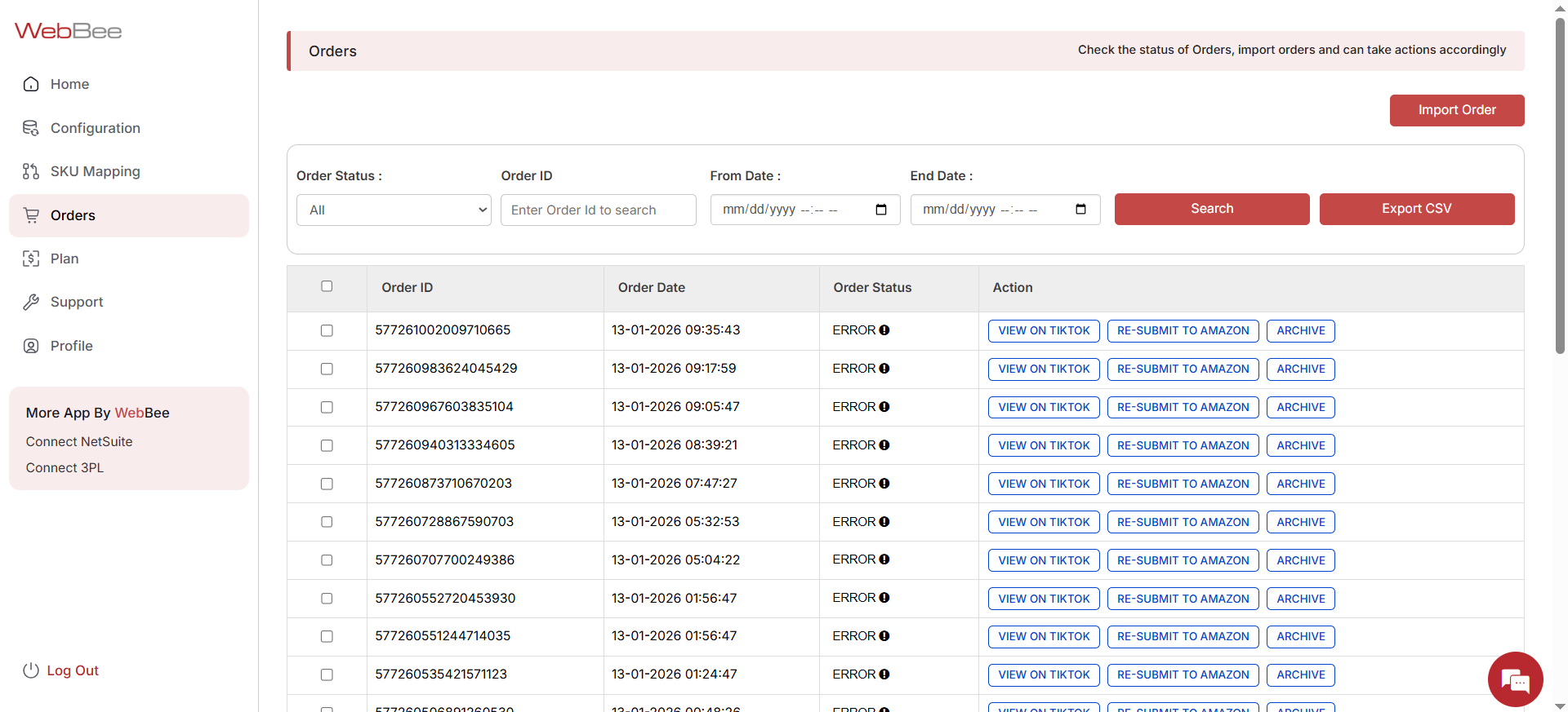 Open the Order Log page of Amazon MCF by the WebBee app, and further click on the Import Order button. Below is a screenshot just to help you understand this visually.