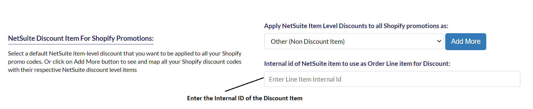 Go to the Discount mapping and chose Other( Non Discount Item) from the drop down menu. Once done please add the Internal id of NetSuite item to use as Order Line item for Discount: