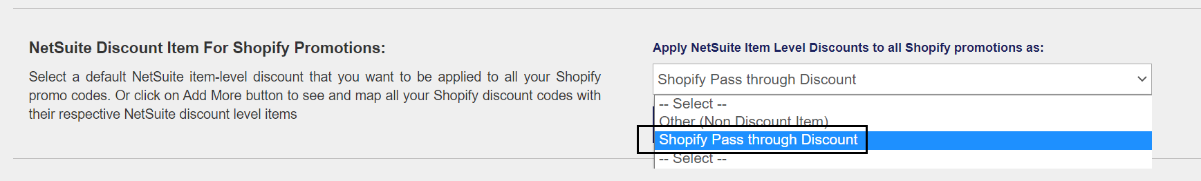 Note : In some cases , if the Shopify codes are dynamic per order , you can chose any discount code from the Drop down menu and we will pass the discount to NetSuite.