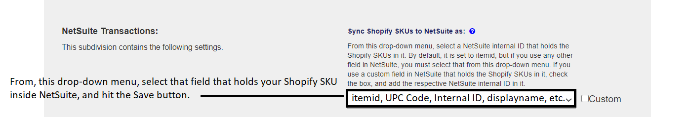 Note: In our case, it is (Item Name / Number), as a result, we selected "itemid", if yours is UPC CODE, select "upccode" inside our app, else the appropriate option. If it is a Custom field, simply check the box, and enter its value inside the empty box.