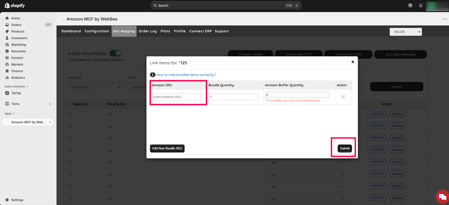 Enter the missing Amazon SKU into the SKU field and then press the Submit button. The screenshot below provides a visual representation of the aforementioned step.