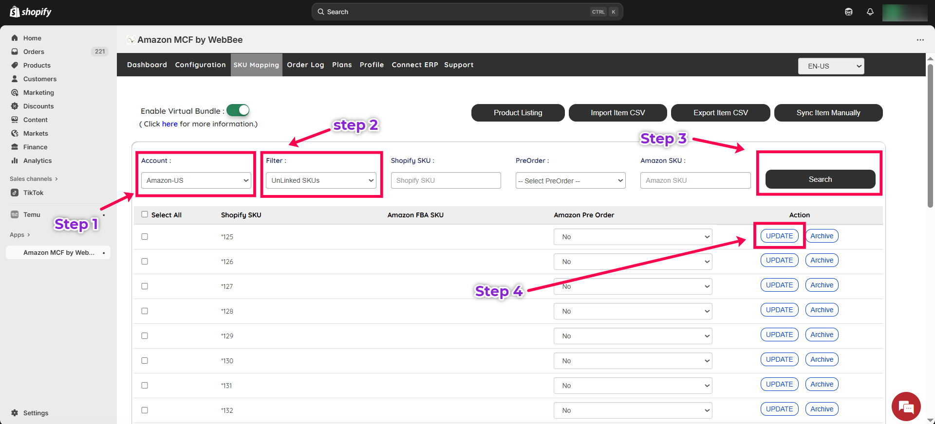 Click on the Update (Link) button corresponding to those Shopify SKUs that you want to update/link with an Amazon SKU.
