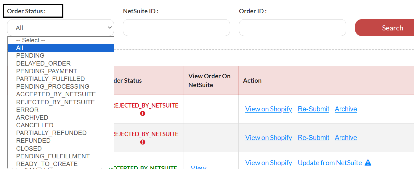 In our application, we have a tab on the Order Log page that will show all the orders sent through Shopify/Non-Shopify Channels. Our order log page contains: One drop-down menu: Order Status. Two search fields: NS ID, and Order ID. View Order on ...