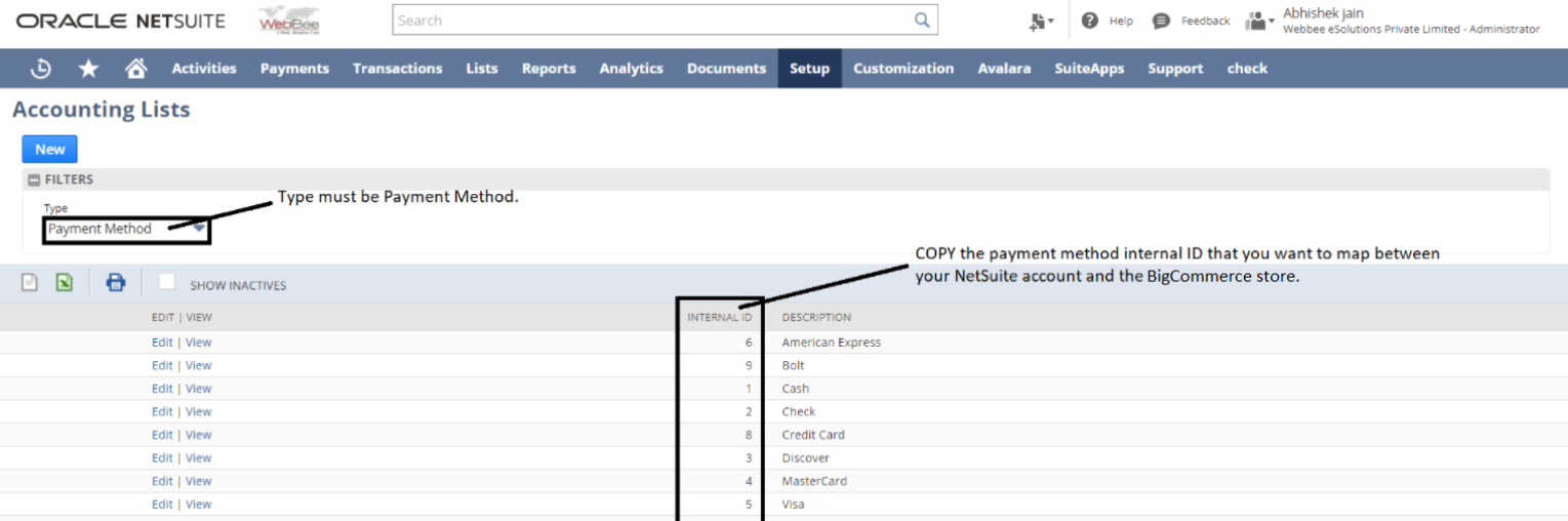 Step 1: Inside NetSuite, from the top navigation pane, please go to the Setup > Accounting > and click on the Accounting Lists. Below is a screenshot to help you understand this visually. Step 2: COPY the payment method internal ID that you want to ...