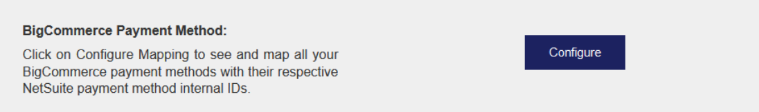 > and scroll-down to this "BigCommerce Payment Method" setting, further click on the Configure button. Post-pop-up click on the Add Payment Method button, and in the BigCommerce Payment Method, enter the BigCommerce payment method name, and in the NetSuite Payment Method ID, enter its corresponding internal ID, further hit the Submit button.