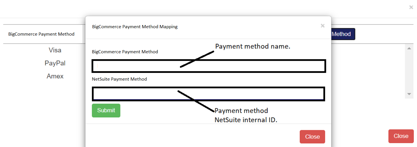 the payment method internal ID that you want to map between your NetSuite account and the BigCommerce store. Below is a screenshot to help you understand this visually.