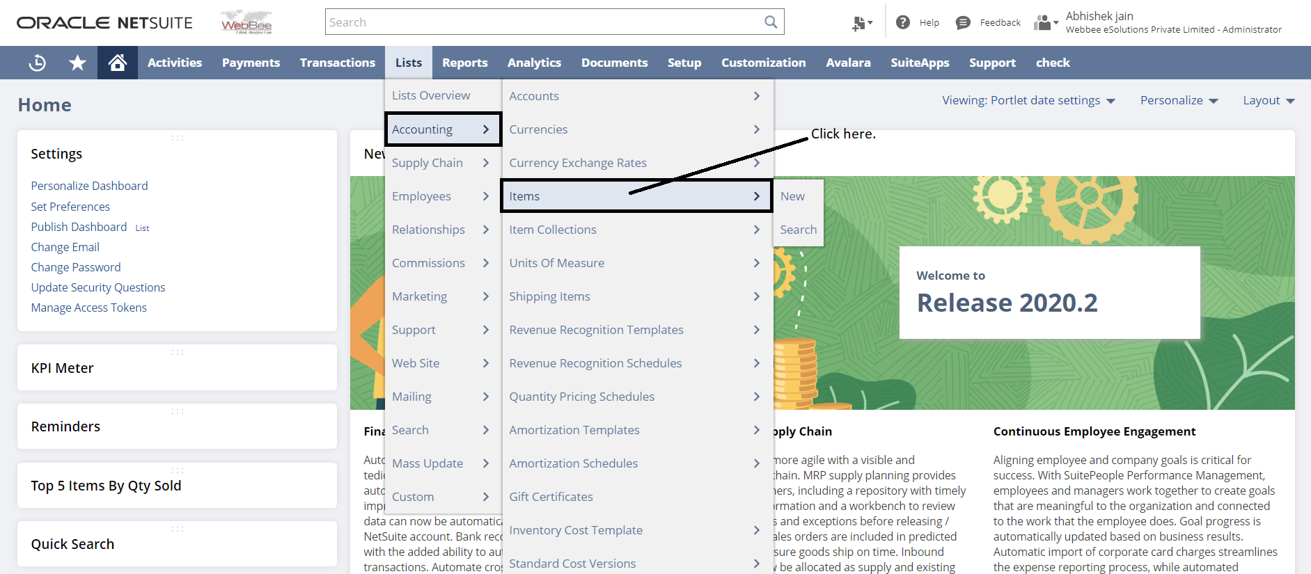 Inside NetSuite, from the top navigation pane, please go to the Lists > Accounting > and click on the Items. Below is a screenshot to help you understand this visually.
