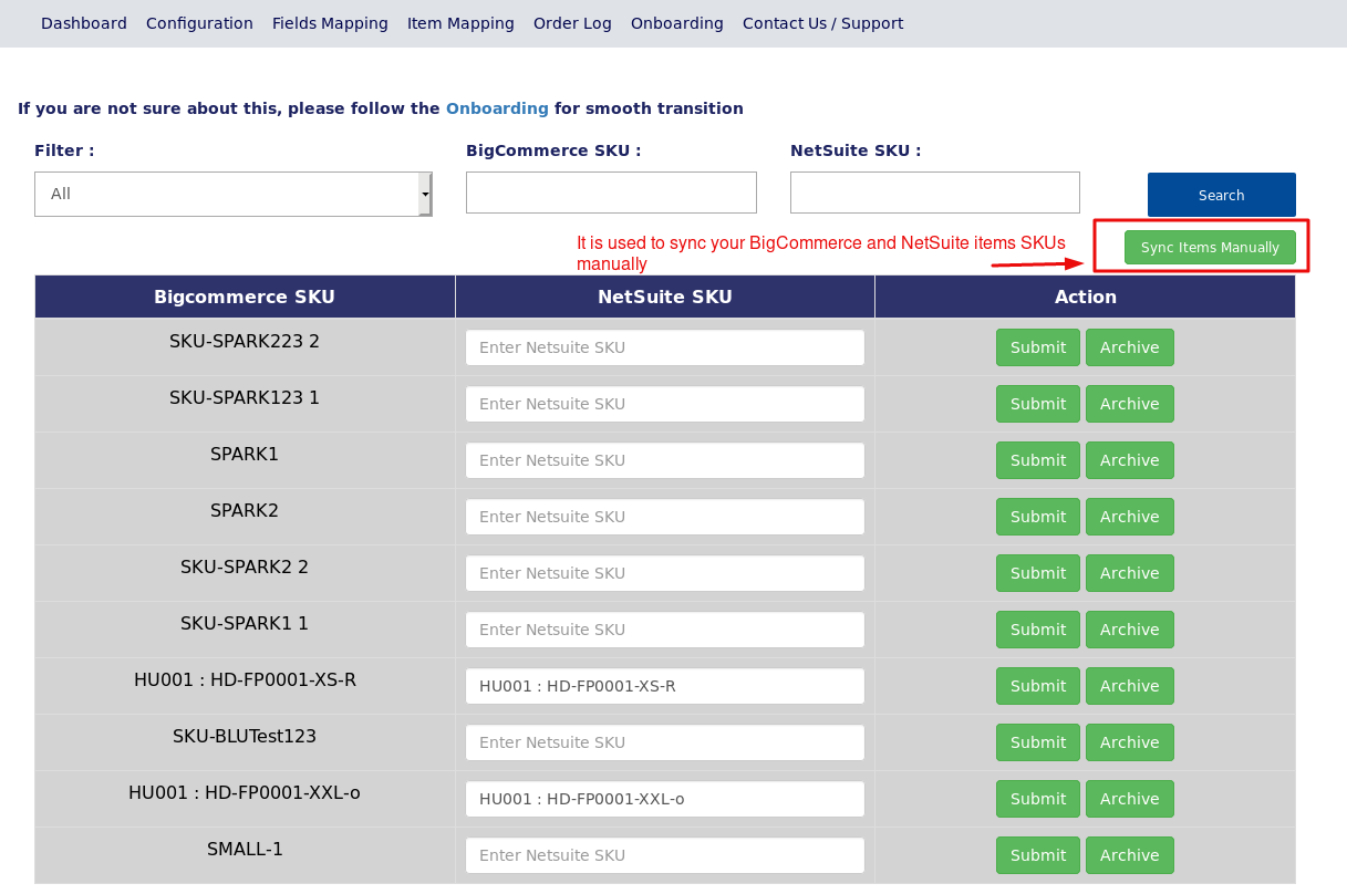 Our products linking page contains: One drop-down menu: 1) Filter. Two search fields: 1) BigCommerce SKU. 2) NetSuite SKU. Sync Items Manually Button, Submit Button, Archive Button, and Export Item CSV button. Drop-down menu: Filter: From, here you ...