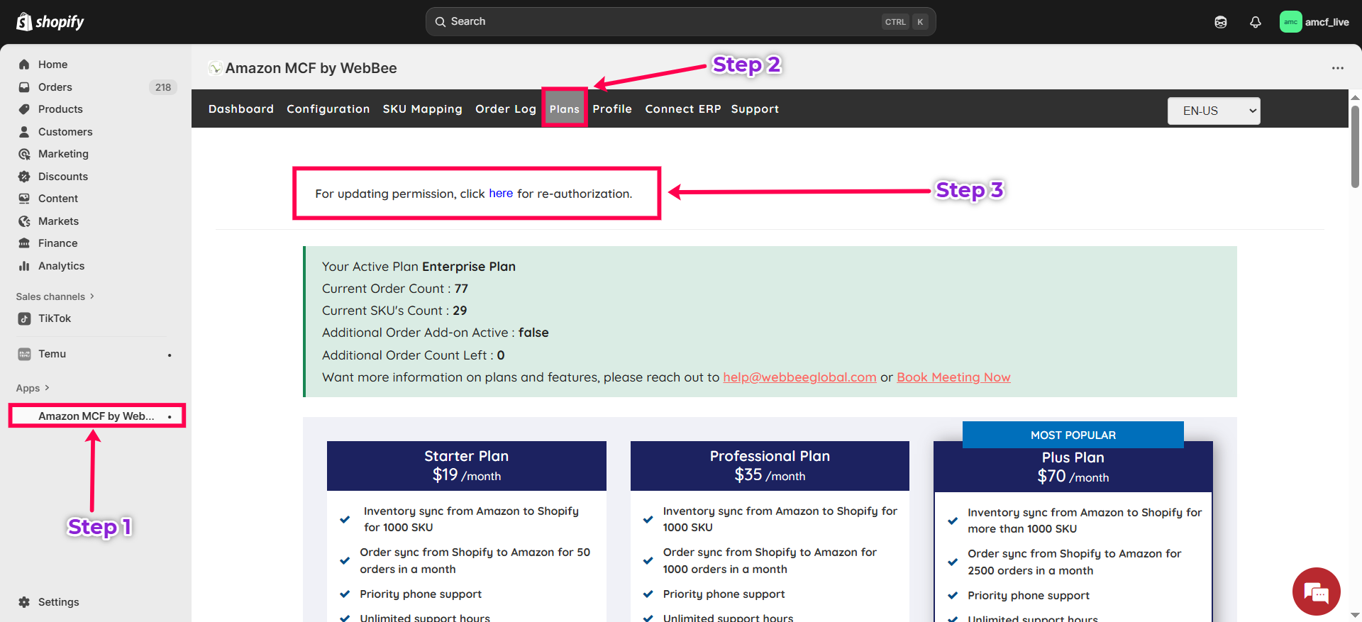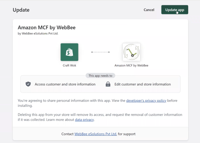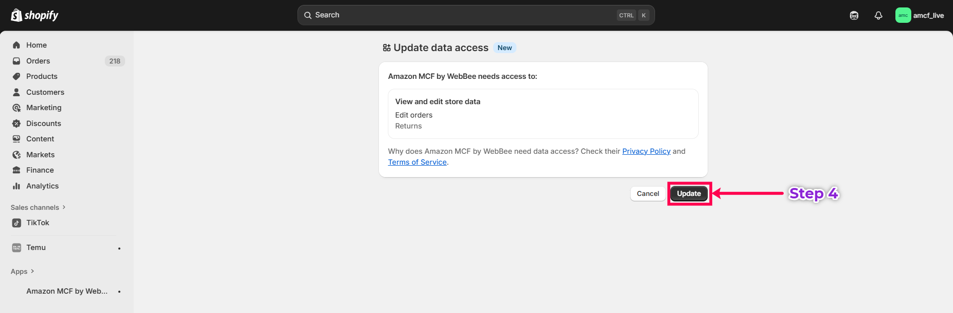 This is an important step to update permissions in our app if you find the sync is not working properly. Note: You need to be an admin user of the Shopify store to make this update.