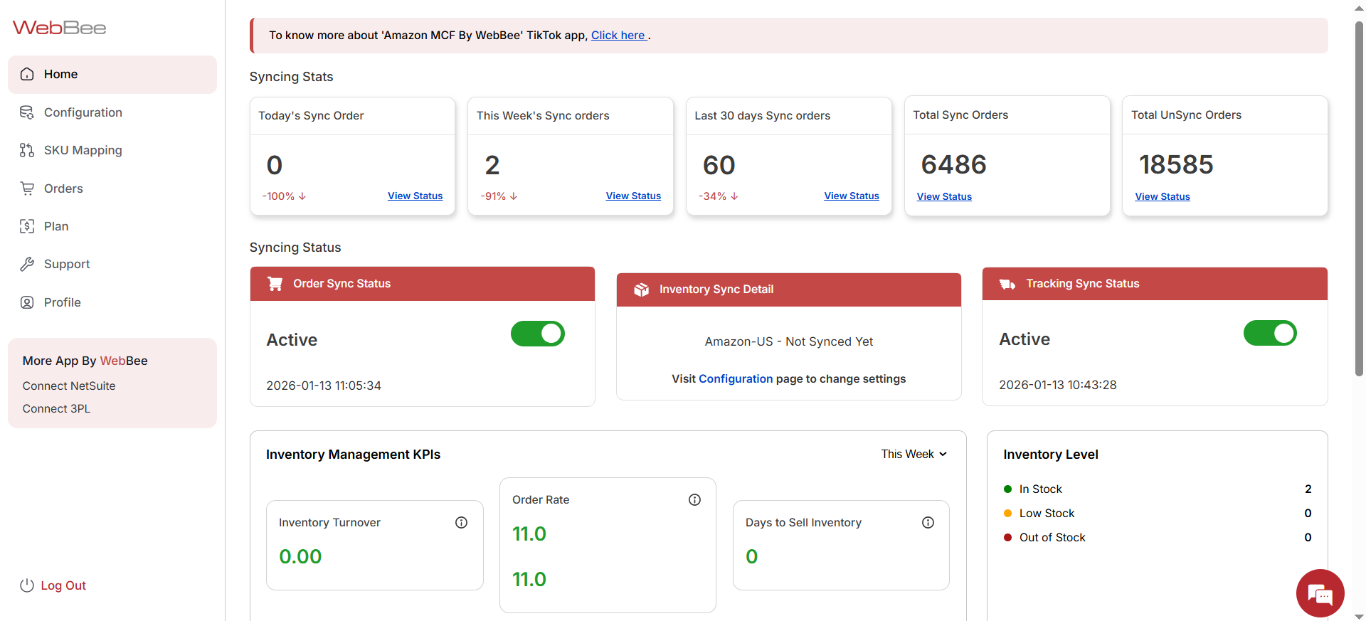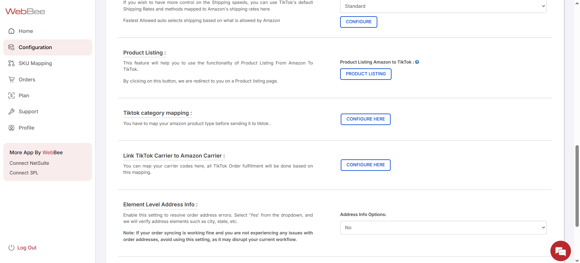 Navigate: From the main menu, go to the 'Configuration' section. This area allows you to manage all the integration settings between TikTok and your Amazon store.