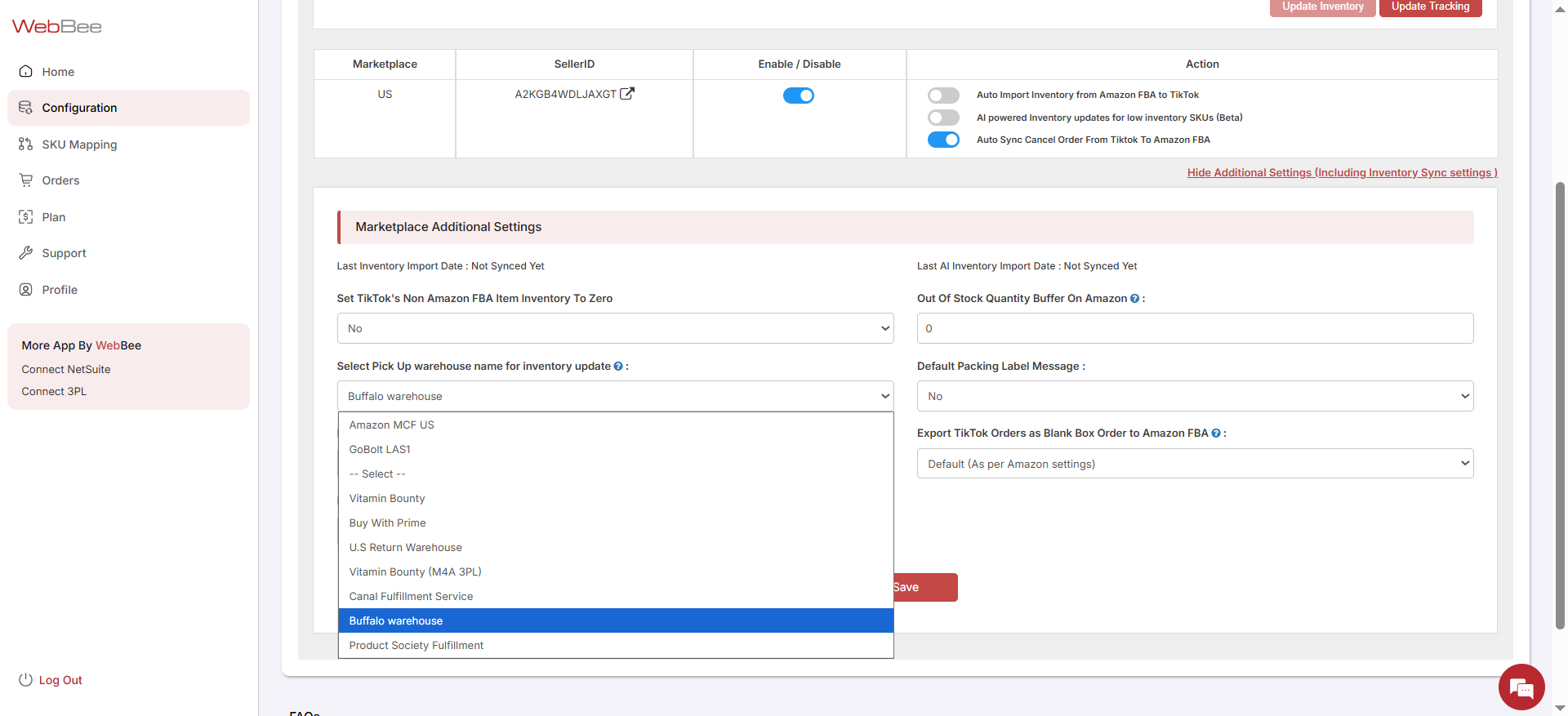 Select Warehouse: From the dropdown menu, only select the ‘pickup warehouse location’ you wish to use for TikTok inventory updates. This selection should align with where your TikTok-linked products are stored and managed.