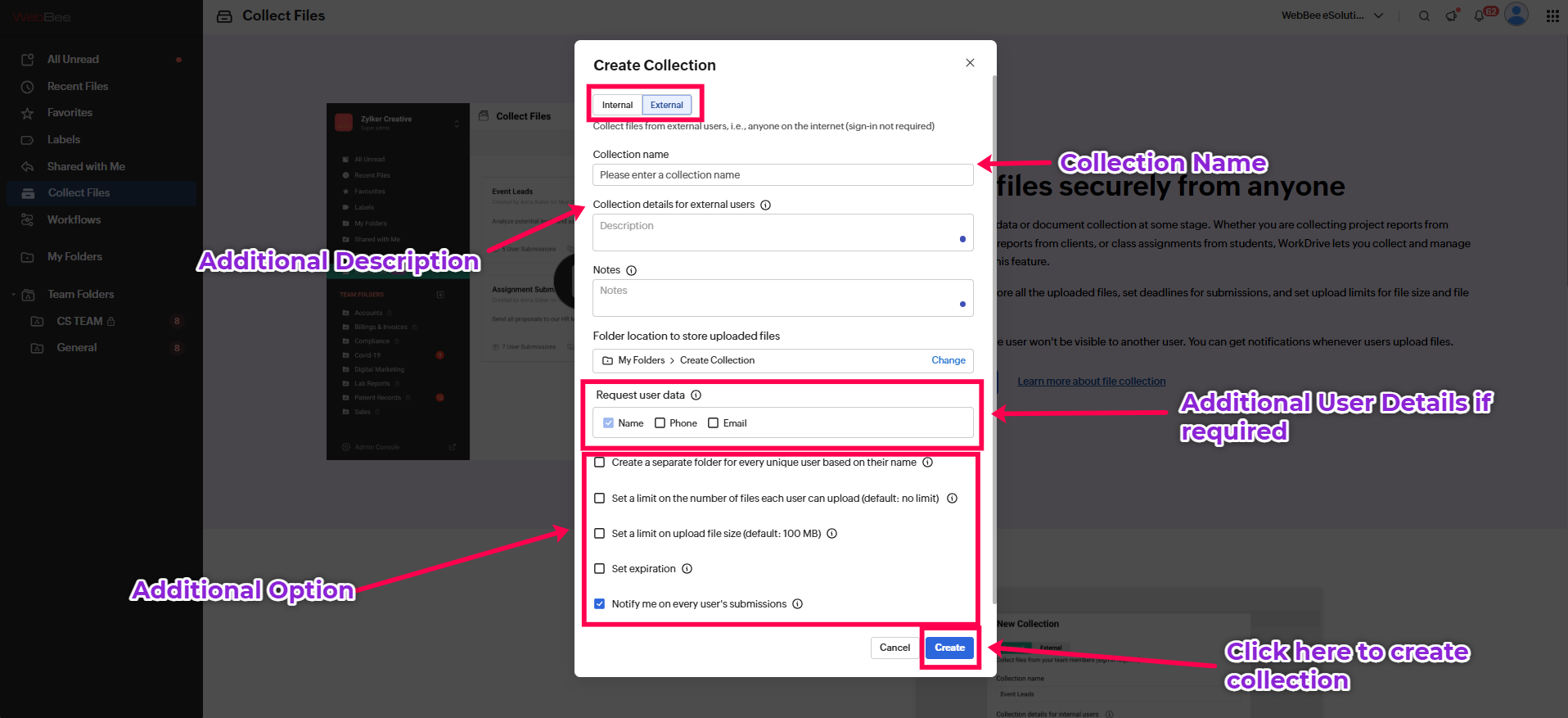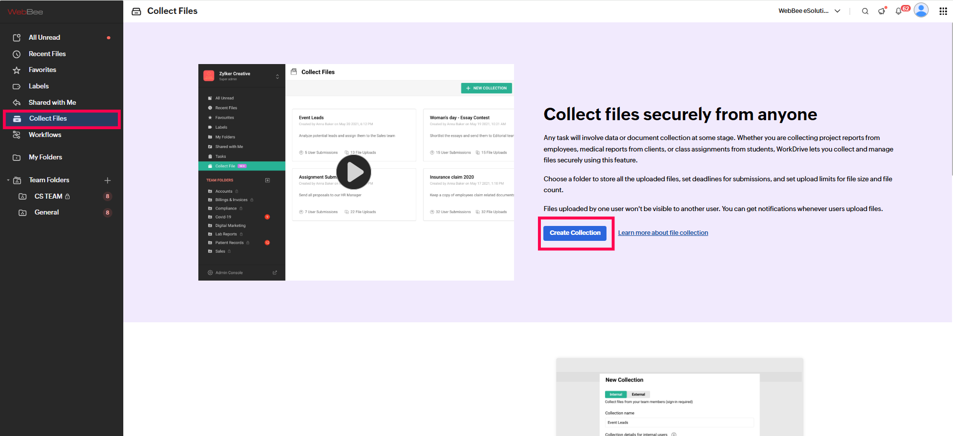 Step 2: On the left side of the navigation bar, click on the "Collect Files" option, then the "Create Collection" button.