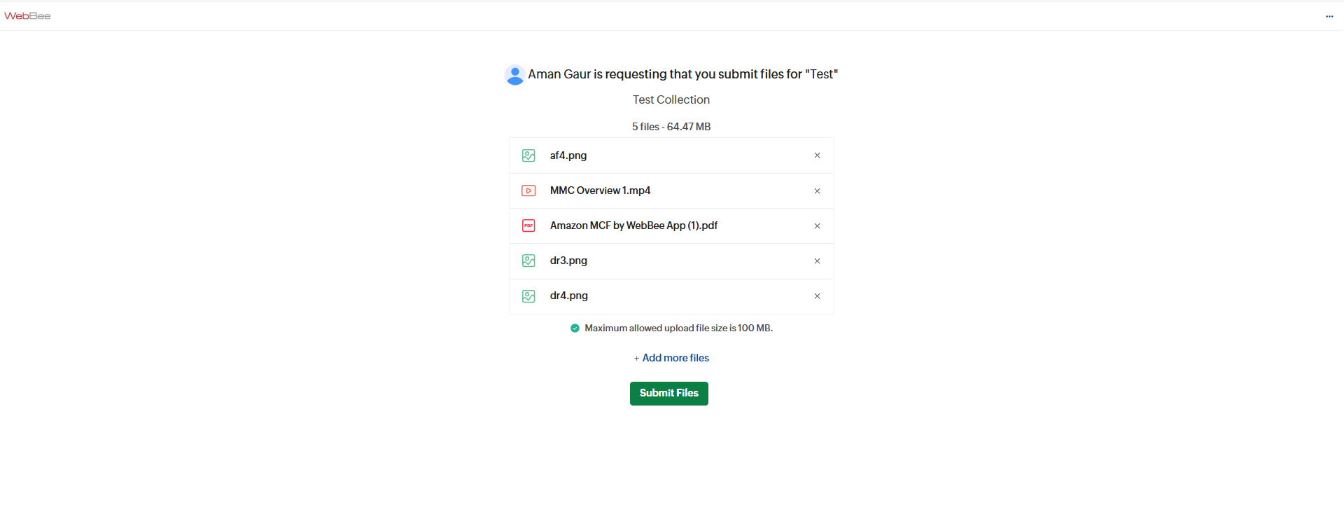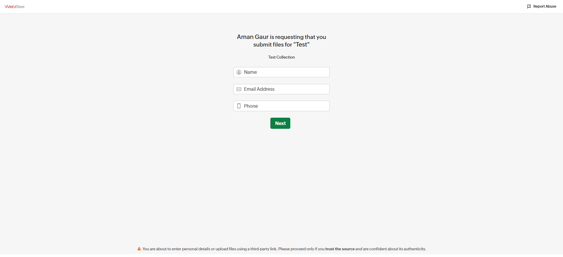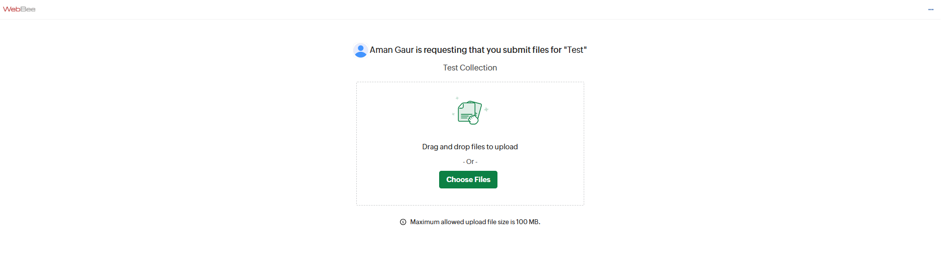 When the client clicks on the link, it will ask for their name, phone number, and email address, if selected during collection creation. The client will then upload credentials in the following formats: txt, Word, Excel, PDF, image, PowerPoint, etc. Once the client uploads the credentials, you will be able to view the files in your collection. Refer to the attached screenshot.