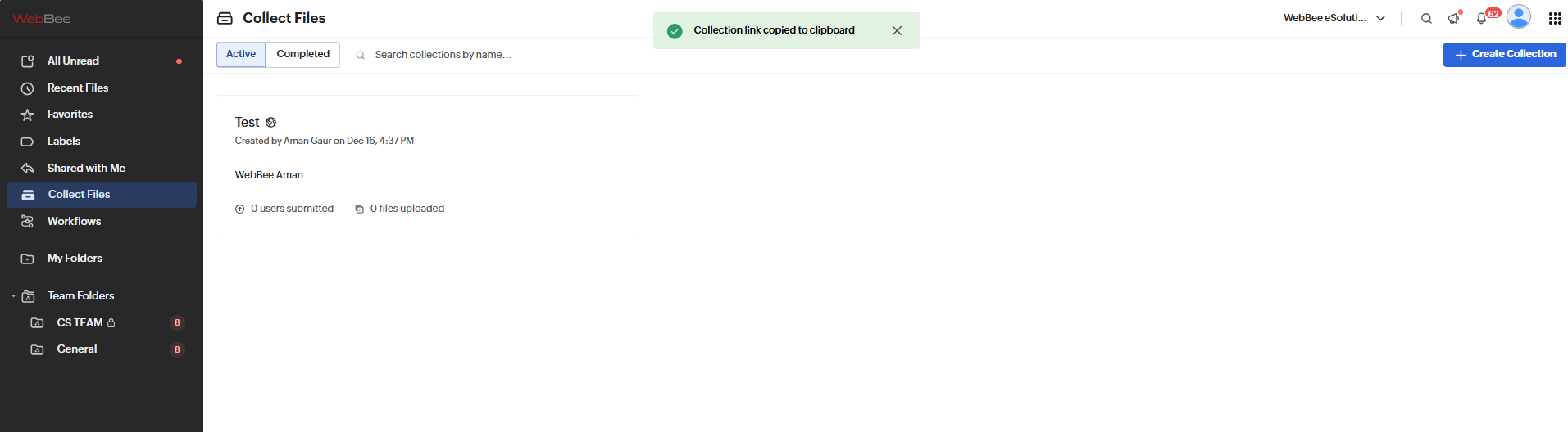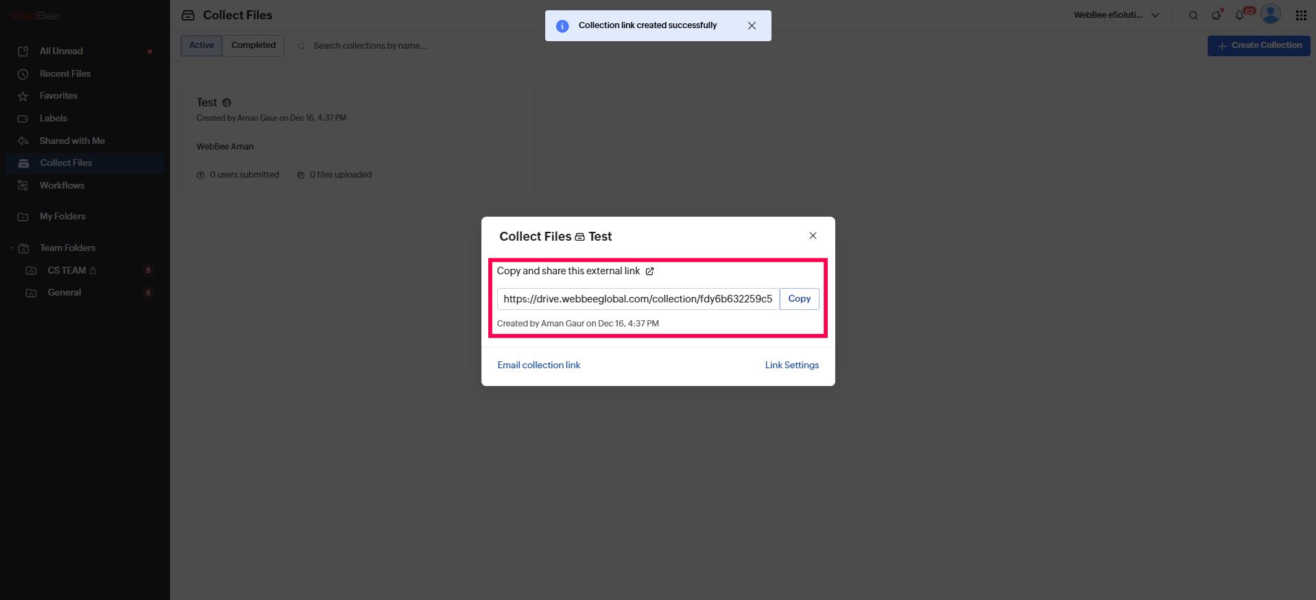 Step 3: After creating the collection, a link will be generated automatically; share this link with the client so that they can securely share the credentials details.