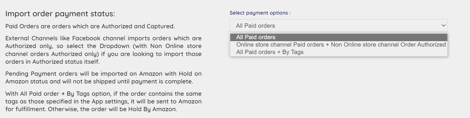 External Channels like Facebook channel imports orders which are Authorized only, so select the Dropdown (with Non-Online store channel orders Authorized only) if you are looking to import those orders in Authorized status itself. Pending Payment orders will be imported on Amazon with Hold on Amazon status and will not be shipped until payment is complete.