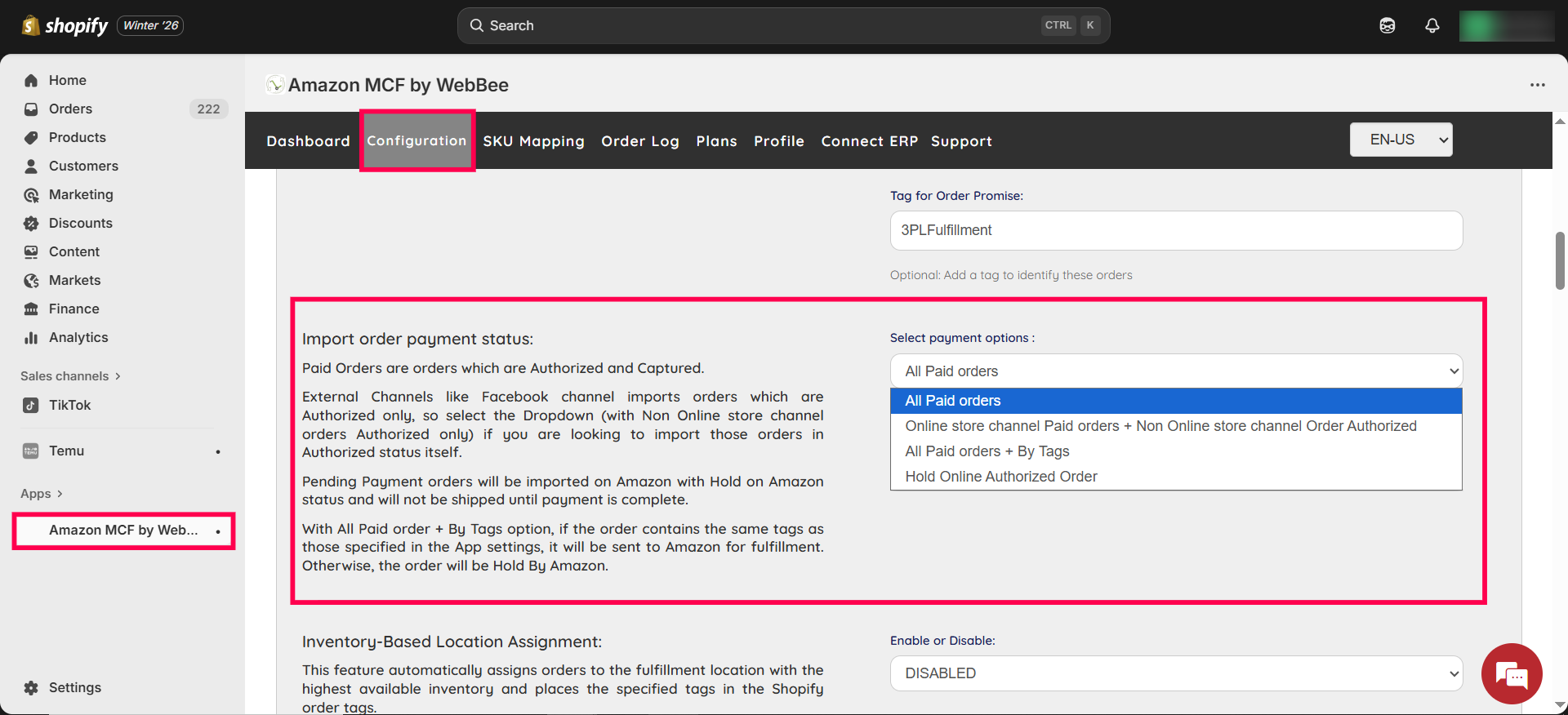 With the "All Paid orders + By Tags" option, if the order contains the same tags as those specified in the app settings, it will be sent to Amazon for fulfillment. Otherwise, the order will be Hold By Amazon.