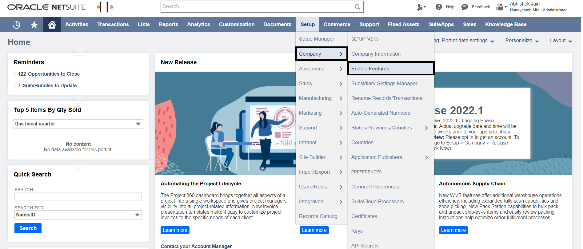 Open your NetSuite account, and from the top-navigation pane, hover over to the Setup > Company > Enable Features. Below is a screenshot to help you understand this visually.