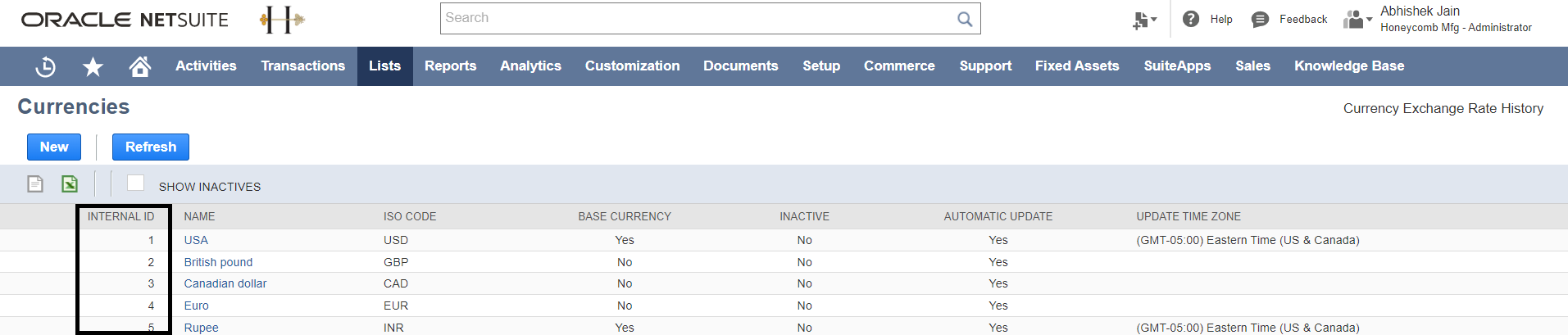 We would need the internal IDs of your NetSuite currencies to do the mapping. To review internal IDs of your NetSuite currencies, open your NetSuite account, hover over to the Lists > Accounting > Currencies. Below are two screenshots to help you understand this visually.