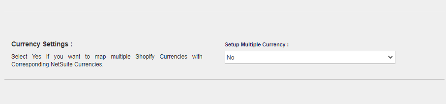 Go to the Configuration Page of the Robust NetSuite Integrator app, expand the App Settings, further scroll-down to the Currency Settings section. Select Yes in the Select Multiple Currency drop-down menu. Once that is done, you will be able to review, further map your Shopify currencies with your NetSuite currencies.