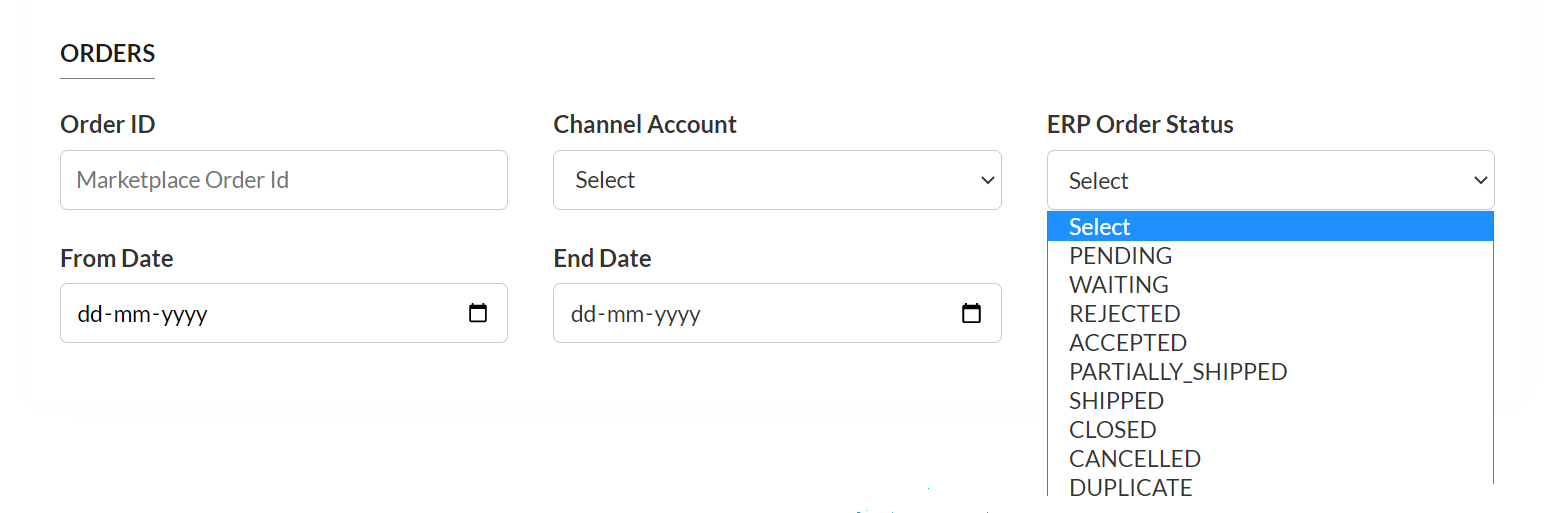 From, here you can filter your orders that are either: Pending , Waiting , Rejected . Accepted , Partially _Shipped , Shipped , closed , cancelled , Duplicate .