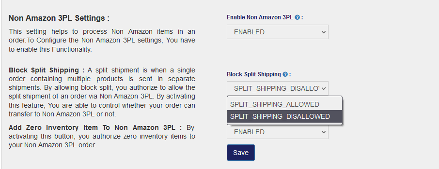 If an order contains 4 items out of which all of the SKUs represents non-Amazon FBA SKU, and are not mapped inside the application, further you have selected "Enabled" in this "Enable Non Amazon 3PL" option, then the entire order will be accepted by your Non-Amazon FBA fulfillment centers. Note: Here, even if you select "Split Shipping Disallowed OR Split Shipping Allowed" in this "Block Split Shipping" option, the order will still be accepted.