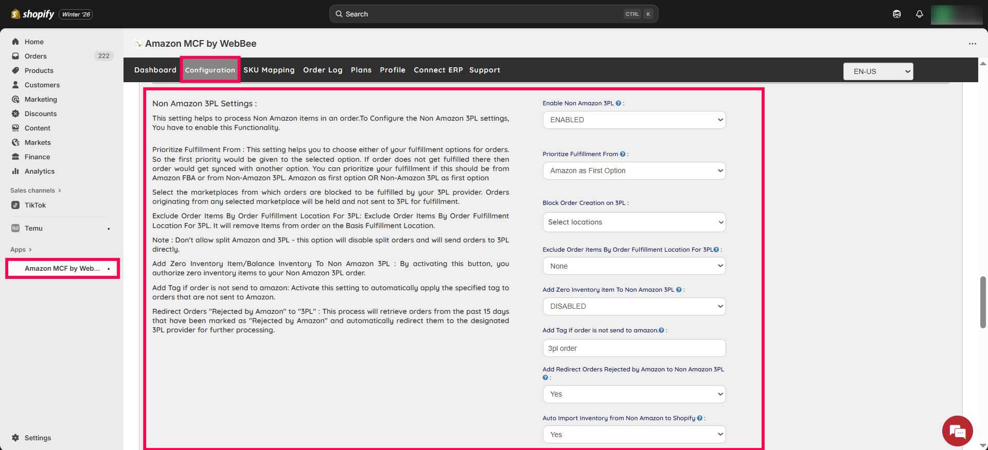 If an order contains 4 items, out of which all 4 represent Amazon FBA SKUs and are mapped inside the application, and further you have selected "Enabled" in the "Enable Non Amazon 3PL" option, then the entire order will be accepted by Amazon for its fulfillment.